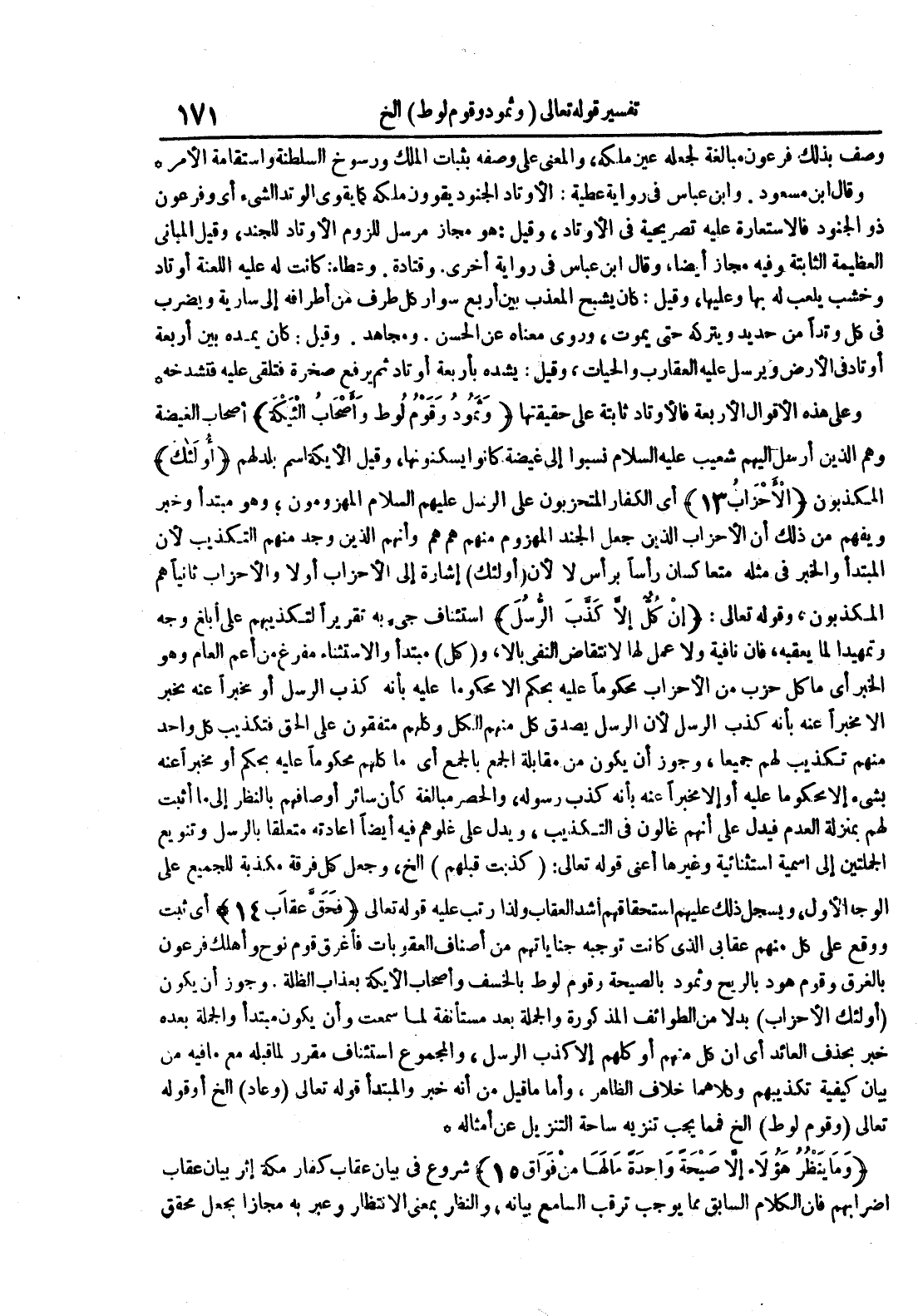 وعلى هذه الأقوال الأربعة فالأوتاد ثابتة على حقيقتها وثمود وقوم لوط وأصحاب الئيكة أصحاب الغيضة وهم الذين أرسل إليهم شعيب عليه السلام نسبوا إلى غيضة كانوا يسكنونها وقيل الأيكة بلد لهم أولئك المكذبون الأحزاب