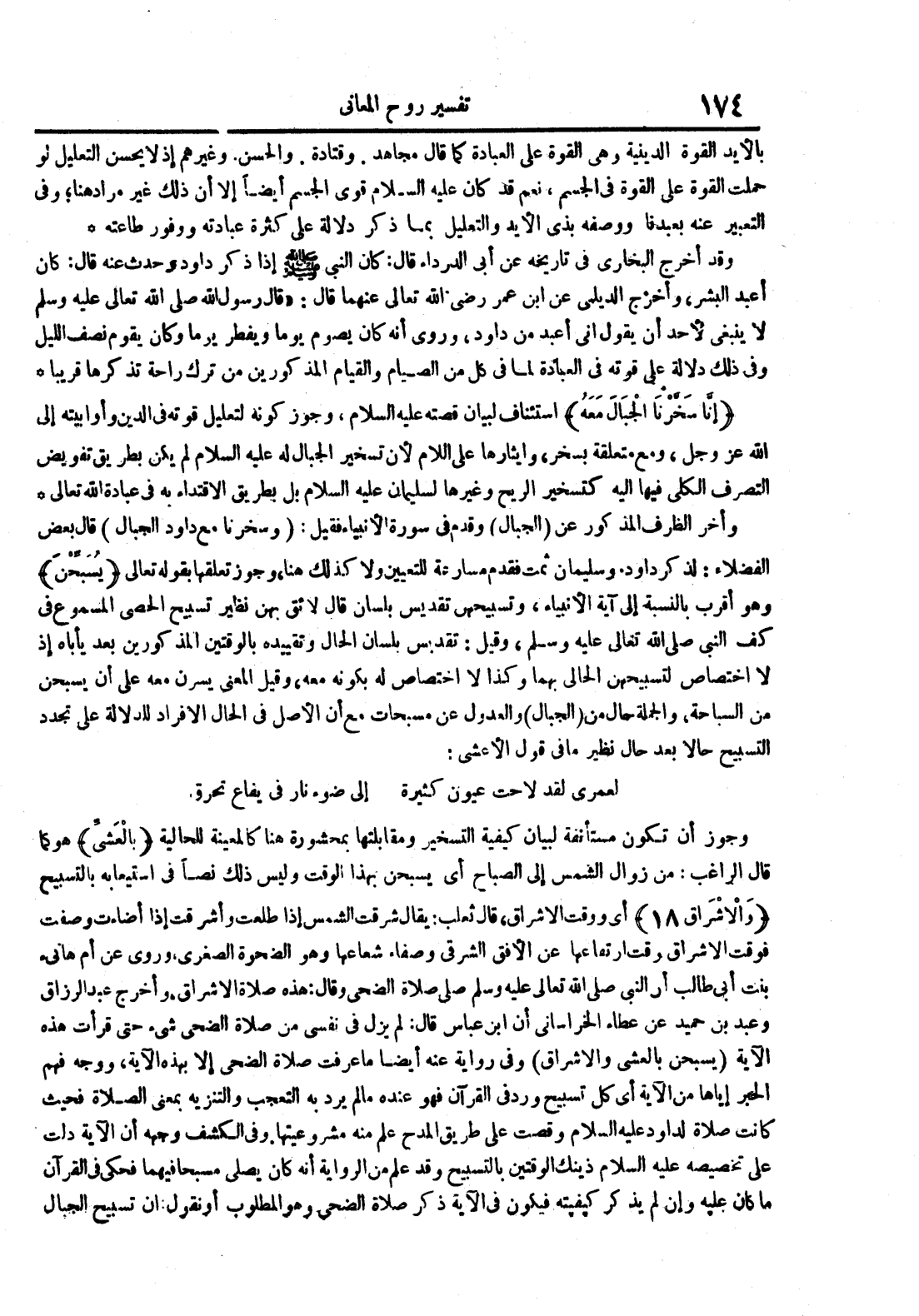- أي ووقت الإشراق قال ثعلب : يقال شرقت الشمس إذا طلعت وأشرقت إذا أضاءت وصفت فوقت الإشراق وقت ارتفاعها عن الأفق الرقي وصفاء شعاعها وهو الضحوة الصغرى وروي عن أم هانيء بنت أبي طالب أن النبي صلى الله تعالى عليه وسلم صلى صلاة الضحى وقال : هذه صلاة الإشراق وأخرج عبد الرزاق وعبد بن حميد عن عطاء الخراساني أن ابن عباس قال : لم يزل في نفسي من صلاة الضحى شيء حتى قرأت هذه الآية يسبحن بالعشي والإشراق وفي رواية عنه أيضا ما عرفت صلاة الضحى إلا بهذه الآية ووجه فهم الخبر إياها من الآية أي كل تبيح ورد في القرآن فهو عنده مالم يرد به التعجب والتنزيه بمعنى الصلاة فحيث كانت صلاة لداود عليه السلام وقصت على طريق المدح علم منه مشروعيتها وفي الكشف وجهه أن الآية دلت على تخصيصه عليه السلام ذينك الوقتين بالتسبيح وقد علم من الرواية أنه كان يصلي مسبحا فيهما فحكى في القرآن ما كان عليه وإن لم يذكر كيفيته فيكون في الآية ذكر صلاة الضحى وهو المطلوب أو نقول أن تسبيح الجبال