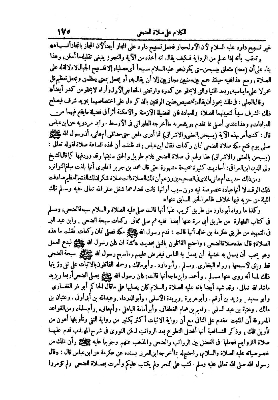 وكذا ما رواه أبو داود من طريق كريب عنها أنها قالت صلى عليه الصلاة و السلام سبحة الضحى ومسلم في كتاب الطهارة من طريق أبي مرة عنها أيضا ففيه ثم صلى ثمان ركعات سبحة الضحى وابن عبد البر في التمهيد من طريق عكرمة بن خالد أنها قالت : قدم رسول الله صلى الله عليه و سلم مكة فصلى ثمان ركعات فقلت ما هذه الصلاة قال : هذه صلاة الضحى واحتج القائلون بالنفي بحديث عائشة أن رسول الله صلى الله عليه و سلم ليدع العمل وهو يحب أن يعمل به خشية أن يعمل به الناس فيفرض عليهم وما سبح رسول الله صلى الله عليه و سلم سبحة الضحى قط وإني لأسبحها رواه البخاري ومسلم وأبو داود وأبو مالك وحمله القائلون بالإثبات على نفي رؤيتها ذلك لما أنه روي عنها مسلم وأحمد وابن ماجه أنها قالت : كان رسول الله صلى الله عليه و سلم يصلي الضحى أربعا ويزيد ما شاء الله تعالى وقد شهد أيضا بأنه عليه الصلاة و السلام كان يصليها على ما قال الحاكم أبو ذر الغفاري وأبو سعيد وزيد بن أرقم وأبو هريرة وبريدة الأسلمي وأبو الدرداء وعبد الله بن أبي أوفى وعتبان بن مالك وعتبة بن عبد السلمي ونعيم بن همام الغطفاني وأبو أمامة الباهلي وأم هانيء وأم سلمة ومن القواعد المعروفة أن المثبت مقدم على النافي مع أن رواية الإثبات أمكثر بكثير من رواية النفي وتأويلها أهون من تأويل تلك وذكر الشافعية أنها أفضل التطوع بعد الرواتب لكن النووي في شرح المهذب قدم عليها صلاة التراويح فجعلها في الفضل بين الرواتب والضحى والمذهب عنهم وجوبها عليه صلى الله عليه و سلم وأن ذلك من خصوصياتها عليه الصلاة و السلام واحتج بما أخرجه ابن العربي بسنده عن عكرمة عن ابن عباس قال : قال رسول الله صلى الله تعالى عليه وسلم كتب على النحر ولم يكتب عليكم وأمرت بصلاة الضحى ولم تؤمروا