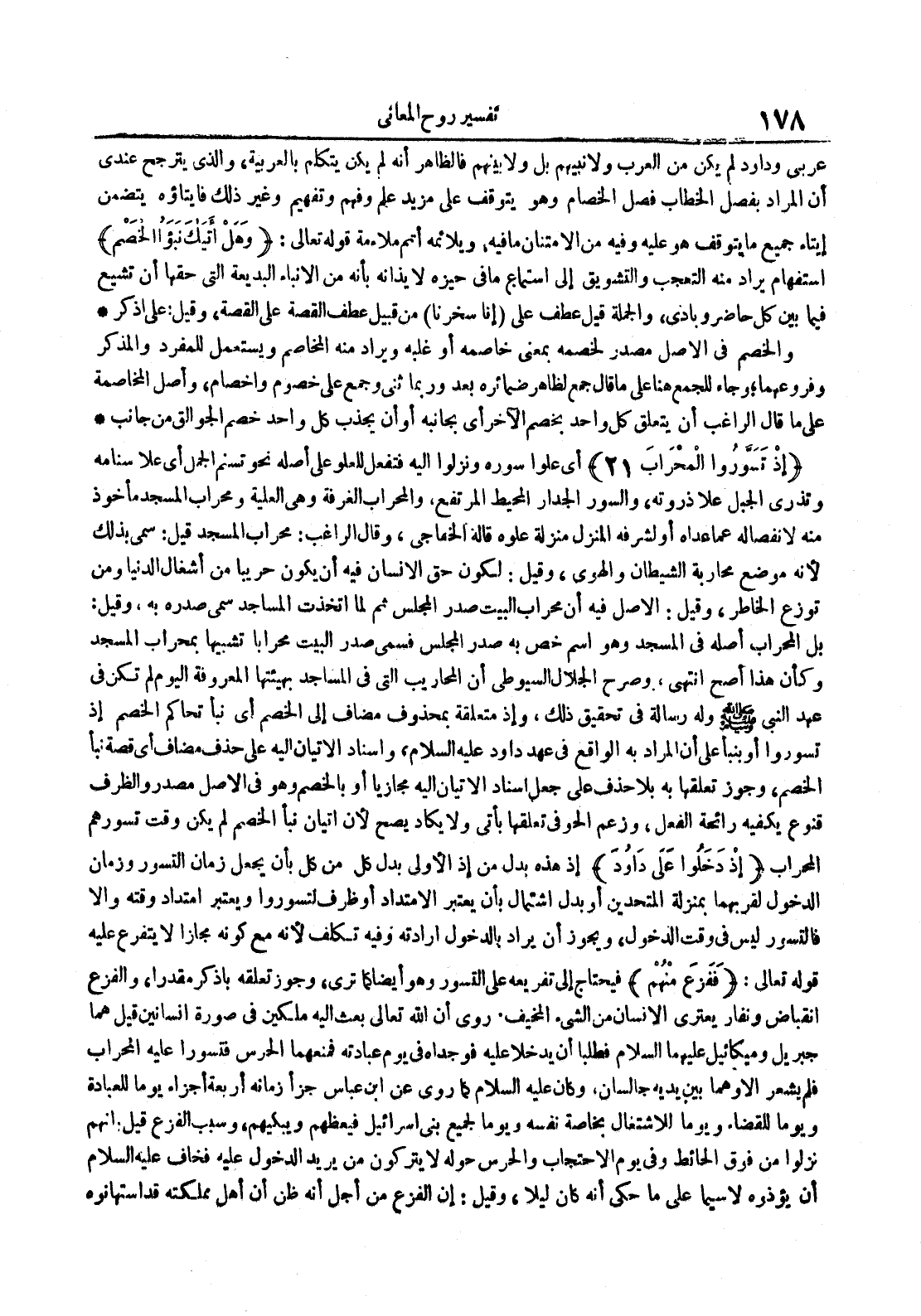 - أي علوا سوره ونزلوا إليه فتفعل للعلو على أصله نحو تسنم الجمل أي علا سنامه وتذري الجبل علا ذروته والسور الجدار المحيط المرتفع والمحراب الغرفة وهي العلية ومحراب المسجد مأخوذ منه لانفصاله عما عداه أو لشرفه المنزل منزلة علوه قاله الخفاجي وقال الراغب : محراب المسجد قيل : سمي بذلك لأنه موضع محاربة الشيطان والهوى وقيل : لكون حق الإنسان فيه أن يكون حربيا من إشغال الدنيا ومن توزيع الخاطر وقيل الأصل فيه أن محراب البيت صدر المجلس ثم اتخذت المساجد سمي صدره به وقيل : بل المراب أصله في المسجد وهو اسم خص به صدر المجلس فسمي صدر البيت محرابا تشبيها بمحراب المسجد وكان هذا أصح انتهى وصرح الجلال السيوطي أن المحاريب التي في المساجد بهيئتها المعروفة اليوم لم تكن في عهد النبي صلى الله عليه و سلم وله رسالة في تحقيق ذلك وإذ متعلقة بمحذوف مضاف إلى الخصم أي نبأ تحاكم الخصم إذ تسوروا أو بنبأ على أن المراد به الواقع في عهد داود عليه السلام وإسناد الإتيان إليه على حذف مضاف أي قصة نبأ الخصم وجوز تعلقها به بلا حذف على جعل إسناد الإتيان إليه مجازيا أو بالخصم وهو في الأصل مصدر والظرف قنوع بكفيه رائحة الفعل وزعم الحوفي تعلقها بأتى ولا يكاد يصح لأن إتيان نبأ الخصم لم يكن وقت تسورهم المحراب إذ دخلوا على داود إذ هذه بدل من إذ الأولى بدل كل من كل بأن يجعل زمان التسور وزمان الدخول لقربهما بمنزلة المتحدين أو بدل اشتمال بأن يعتبر الإمتداد أو ظرف لتسوروا ويعتبر امتداد وقته وإلا فالتسور ليس في وقت الدخول ويجوز أن يراد بالدخول إرادته وفيه تكلف لأنه مع كونه مجازا لا يتفرع عليه قوله تعالى : ففزع منهم فيحتاج إلى تفريعه على التسور وهو أيضا كما ترى وجوز تعلقه باذكر مقدرا والفزع انقباض ونفار يعتري الإنسان من الشيء المخيف روي أن الله تعالى بعث إليه ملكين في صورة إنسانين قيل هما جبريل وميكائيل عليهما السلام فطلبا أن يدخلا عليه فوجداه في يوم عبادته فمنعهما الحرس فتسورا عليه المحراب فلم يشعر إلا وهما بين يديه جالسان وكان عليه السلام كما روي عن ابن عباس جزأ زمانه أربعة أجزاء يوما للعبادة ويوما للقضاء ويوما للإشتغال بخاصة نفسه ويوما لجميع بني إسرائيل فيعظهم ويبكيهم وسبب الفزع قيل أنهم نزلوا من فوق الحائط وفي يوم الإحتجاب والحرس حوله لا يتركون من يريد الدخول عليه فخاف عليه السلام أن يؤذوه لا سيما على ما حكى أنه كان ليلا وقيل : إن الفزع من أجل أنه ظن أن أهل مملكته قد استهانوه