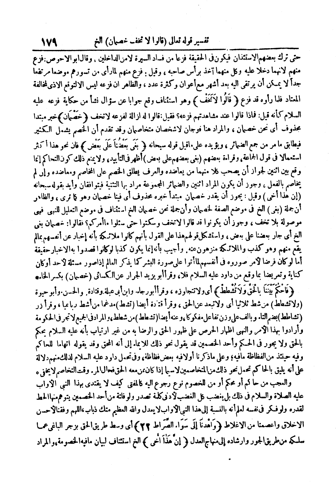 حتى ترك بعضهم الإستئذان فيكون في الحقيقة فزعا من فساد السيرة لا من الداخلين وقال أبو الأحوص : فزع منهم لأنهما دخلا عليه وكل منهما آخذ برأس صاحبه وقيل : فزع منهم لما رأى من تسورهم موضعا مرتفعا جدا لا يمكن أن يرقى إليه بعد أشهر من أعوان وكثرة عدد والظاهر أن فزعه ليس إلا لتوقع الأذى لمخالفة المعتاد فلما رأه قد فزع قالوا لا تخف وهو استئناف وقع جوابا عن سؤال نشأ من حكاية فزعه عليه السلام كأنه قيل : فماذا قالوا عند مشاهدتهم فزعه فقيل : قالوا له إزالة لفزعه لا تخف خصمان خبر مبتدأ محذوف أي نحن خصمان والمراد هنا فوجان لا شخصان متخاصمان وقد تقدم أن الخصم يشمل الكثير فيطابق ما مر من جميع الضمائر ويؤيده على ما قيل قوله سبحانه بغى بعضنا على بعض فإن نحو هذا أكثر استعمالا في قول الجماعة وقراءة بعضهم بغى بعضهم على بعض أظهر في التأييد ولا يمنع ذلك كون التحاكم إنما وقع بين اثنين لجواز أن يصحب كلا منهما من يعاضده والعرف يطلق الخصم على المخاصم ومعاضده وإن لم يخاصم بالفعل وجوز أن يكون المراد اثنين والضمائر المجموعة مراد التثنية فيتوافقان وأيد بقوله سبحانه إن هذا أخي وقيل : يجوز أن يقدر خصمان مبتدا خبره محذوف أي فينا خصمان وهو كما ترى والظاهر أن جملة بغى الخ في موضع الصفة لخصمان وأن جملة نحن الخ استئناف في موضع التعليل للنهي فهي موصولة بلا تخف وجوز أن يكونوا قد قالوا لا تخف وسكتوا حتى سئلوا ما أمركم فقالوا : خصمان بغى الخ أي جار بعضنا على بعض واستشكل قولهم هذا على القول بأنهم كانوا ملائكة بأنه إخبار عن أنفسهم بما لم يقع منهم وهو كذب والملائكة منزهون عنه وأجيب بأنه يكون كذبا لو كانوا قصدوا به الإخبار حقيقة أما لو كان فرضا لأمر صوروه في أنفسهم لما أتوا على صورة البشر كما يذكر العالم إذا صور مسئلة لأحد أو كان كناية وتعريضا بما وقع من داود عليه السلام فلا وقرأ أبو يزيد الجرار عن الكسائي خصمان بكسر الخاء