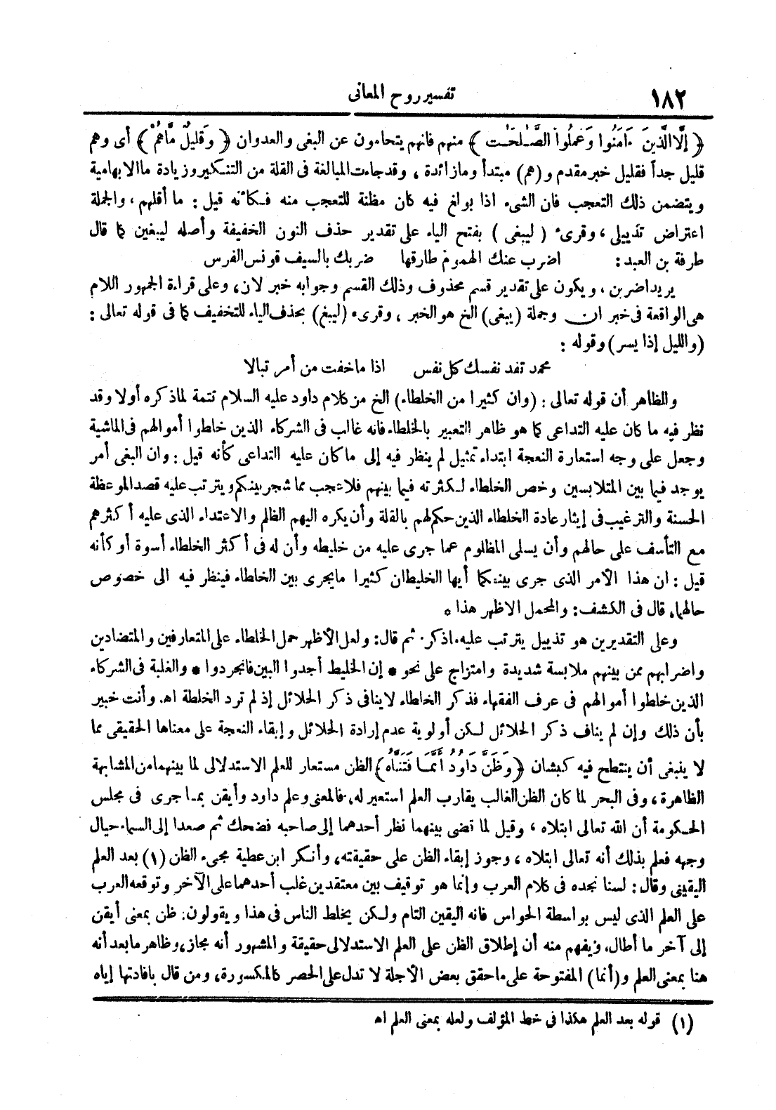 إلا الذين آمنوا وعملوا الصالحات منهم فإنهم يتحامون عن البغي والعدوان وقليل ما هم أي وهم قليل جدا فقيل خبر مقدم و هم مبتدأ وما زائدة وقد جاءت المبالغة في القلة من التنكير وزيادة ما الإبهامية ويتضمن ذلك التعجب فإن الشيء إذا بولغ فيه كان مظنة للتعجب منه فكأنه قيل : ما أقلهم والجملة اعتراض تذييلي وقريء ليبغي بفتح الياء على تقدير حذف النون الخفيفة وأصله ليبغين كما قال طرفة بن العبد : اضرب عنك الهموم طارقها ضربك بالسيف قونس الفرس يريد اضربن ويكون على تقدير قسم محذوف وذلك القسم وجوابه خبر لأن وعلى قراءة الجمهور اللام هي الواقعة في خبر إن وجملة يبغي الخ هو الخبر وقريء ليبغ بحذف الياء للتخفيف كما في قوله تعالى : والليل إذا يسر وقوله : محمد تفد نفسك كل نفس إذا ما خفت من أمر تبالا والظاهر أن قوله تعالى : وإن كثيرا من الخلطاء الخ من كلام داود عليه السلام تتمة لما ذكره أولا وقد نظر فيه ما كان عليه التداعي كما هو ظاهر التعبير بالخلطاء فإنه غالب في الشركاء الذين خلطوا أموالهم في الماشية وجعل وجه استعارة النعجة ابتداء تمثيل لم ينظر فيه إلى ما كان عليه التداعي كأنه قيل : وإن البغي أمر يوجد فيما بين المتلابسين وخص الخلطاء لكثرته فيما بينهم فلا عجب مما شجر بينكم ويترتب عليه قصد الموعظة الحسنة والترغيب في إيثار عادة الخلطاء الذين حكم لهم بالقلة وأن يكره إليهم الظلم والإعتداء الذي عليه أكثرهم مع التأسف على حالهم وأن يسلي المظلوم عما جرى عليه من خليطه وأن له في أكثر الخلطاء أسوة أو كأنه قيل : إن هذا الأمر الذي جرى بينكما أيها الخليطان ثيرا ما يجري بين الخلطاء فينظر فيه إلى خصوص حالهما قال في الكشف : والمحمل الأظهر هذا