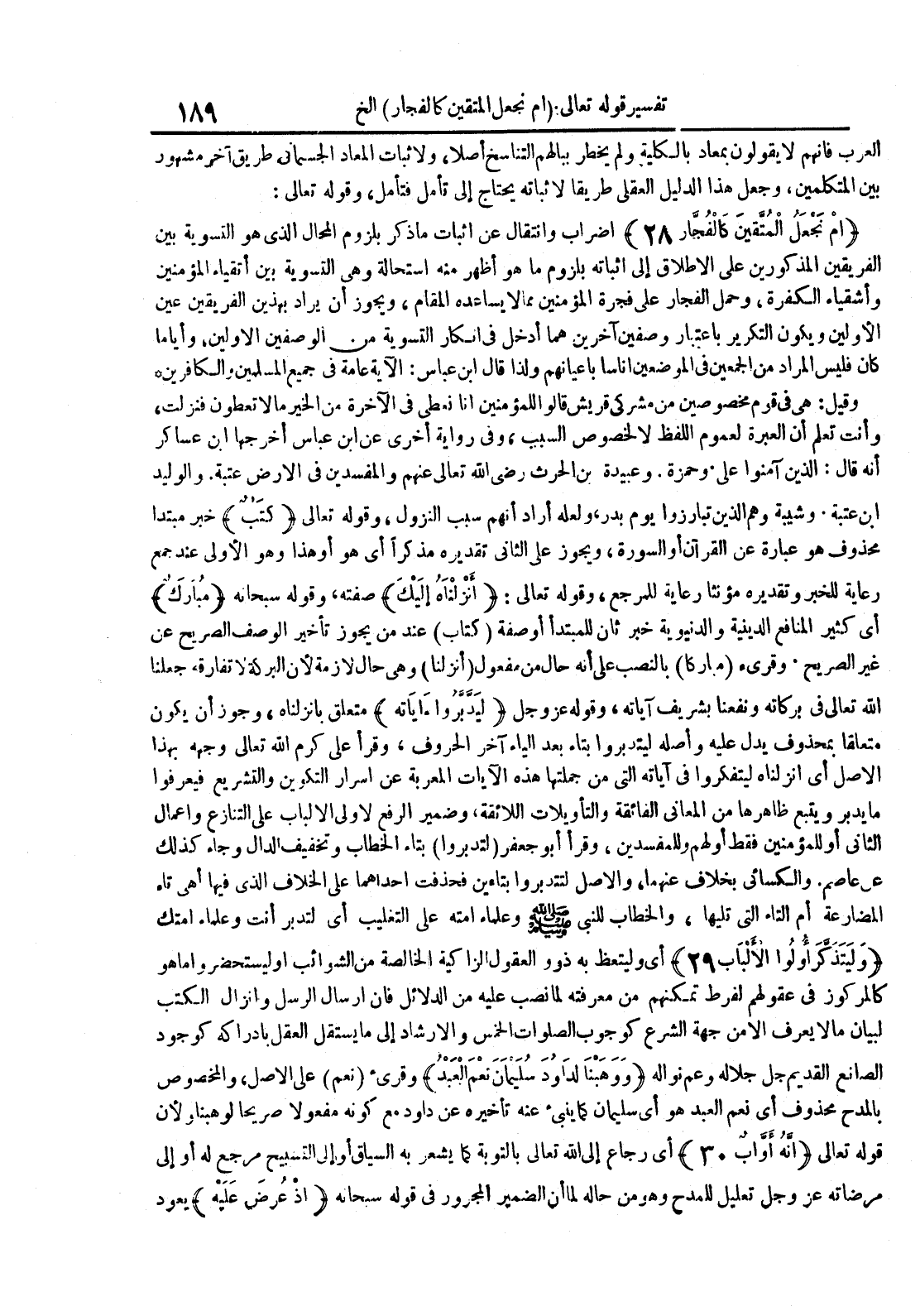 وقيل : هي في قوم مخصوصين من مشركي قريش قالوا للمؤمنين إنا نعطي في الآخرة من الخير ما لا تعطون فنزلت وأنت تعلم أن العبرة لعموم اللفظ لا لخصوص السبب وفي رواية أخرى عن ابن عباس أخرجها ابن عساكر أنه قال : الذين آمنوا علي وحمزة وعبيدة بن الحرث رضي الله تعالى عنهم والمفسدين في الأرض عتبة والوليد ابن عتبة وشيبة وهم الذين تبارزوا يوم بدر ولعله أراد أنهم سبب النزول وقوله تعالى كتاب خبر مبتدأ محذوف هو عبارة عن القرآن أو السورة ويجوز على الثاني تقديره مذكر أي هو أو هذا وهو الأولى عند جمع رعاية للخبر وتقديره مؤنثا رعاية للمرجع وقوله تعالى : أنزلناه إليك صفته وقوله سبحانه مبارك أي كثير المنافع الدينية والدنيوية خبر ثان للمبتدأ أو صفة كتاب عند من يجوز تأخير الوصف الصريح عن غير الصريح وقريء مباركا بالنصب على أنه حال من مفول أنزلنا وهي حال لازمة لأن البركة لا تفارقه جعلنا الله تعالى في بركاته ونفعنا بشريف آياته وقوله عز و جل ليدبروا آياته متعلق بأنزلناه وجوز أن يكون متعلقا بمحذوف يدل عليه وأصله ليتدبروا بتاء بعد الياء آخر الحروف وقرأ علي كرم الله تعالى وجهه بهذا الأصل أي أنزلناه ليتفكروا في آياته التي من جملتها هذه الآيات المعربة عن أسرار التكوين والتشريع فيعرفوا ما يدبر ويتبع ظاهرها من المعاني الفائقة والتأويلات اللائقة وضمير الرفع لأولي الألباب على التنازع وأعمال الثاني أو للمؤمنين فقط أو لهم وللمفسدين وقرأ أبو جعفر لتدبروا بتاء الخطاب وتخفيف الدال وجاء كذلك عن عاصم والكسائي بخلاف عنهما والأصل لتتدبروا بتاءين فحذفت أحدهما على الخلاف الذي فيها أهي تاء المضارعة أم تاء التي تليها والخطاب للنبي صلى الله عليه و سلم وعلماء أمته على التغليب أي لتدبر أنت وعلماء أمتك وليتذكر أولوا الألباب