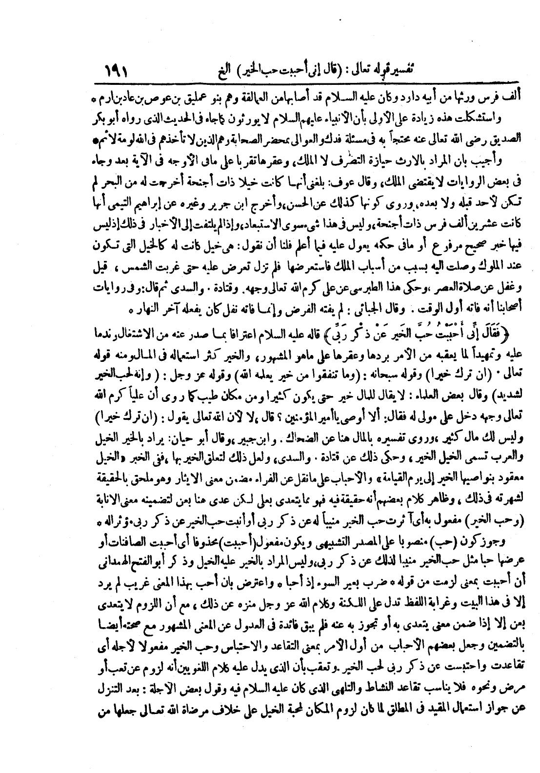 فقال إني أحببت حب الخير عن ذكر ربي قاله عليه السلام اعترافا بما صدر عنه من الإشتغال وندما عليه وتمهيدا لما يعقبه من الأمر بردها وعقرها على ما هو المشهور والخير كثر استعماله في المال ومنه قوله تعالى إن ترك خيرا وقوله سبحانه ك وما تنفقوا من خير يعلمه الله وقوله عز و جل : وإنه لحب الخير لشديد وقال بعض العلماء : لا يقال للمال خير حتى يكون كثيرا ومن مكان طيب كما روي أن عليا كرم الله تعالى وجهه دخل على مولى له فقال : ألا أوصي يا أمير المؤمنين قال لا لأن الله تعالى يقول : إن ترك خيرا وليس لك مال كثير وروي تفسيره بالمال هنا عن الضحاك وابن جبير وقال أبو حيان : يراد بالخير الخيل والعرب تسمي الخيل الخير وحكى ذلك عن قتادة والسدي ولعل ذلك لتعلق الخير بها ففي الخبر الخيل معقود بنواصيها الخير إلى يوم القيامة والأحباب على ما نقل عن الفراء مضمن معنى الإيثار وهو ملحق بالحقيقة لشهرته في ذلك وظاهر كلام بعضهم أنه حقيقة فيه فهو مما يتعدى بعلي لكن عدي هنا بعن لتضمينه معنى الإنابة وحب الخير مفعول آثرت حب الخير منيبا له عن ذكر ربي أو أنبت حب الخير عن ذكر ربي مؤثرا له