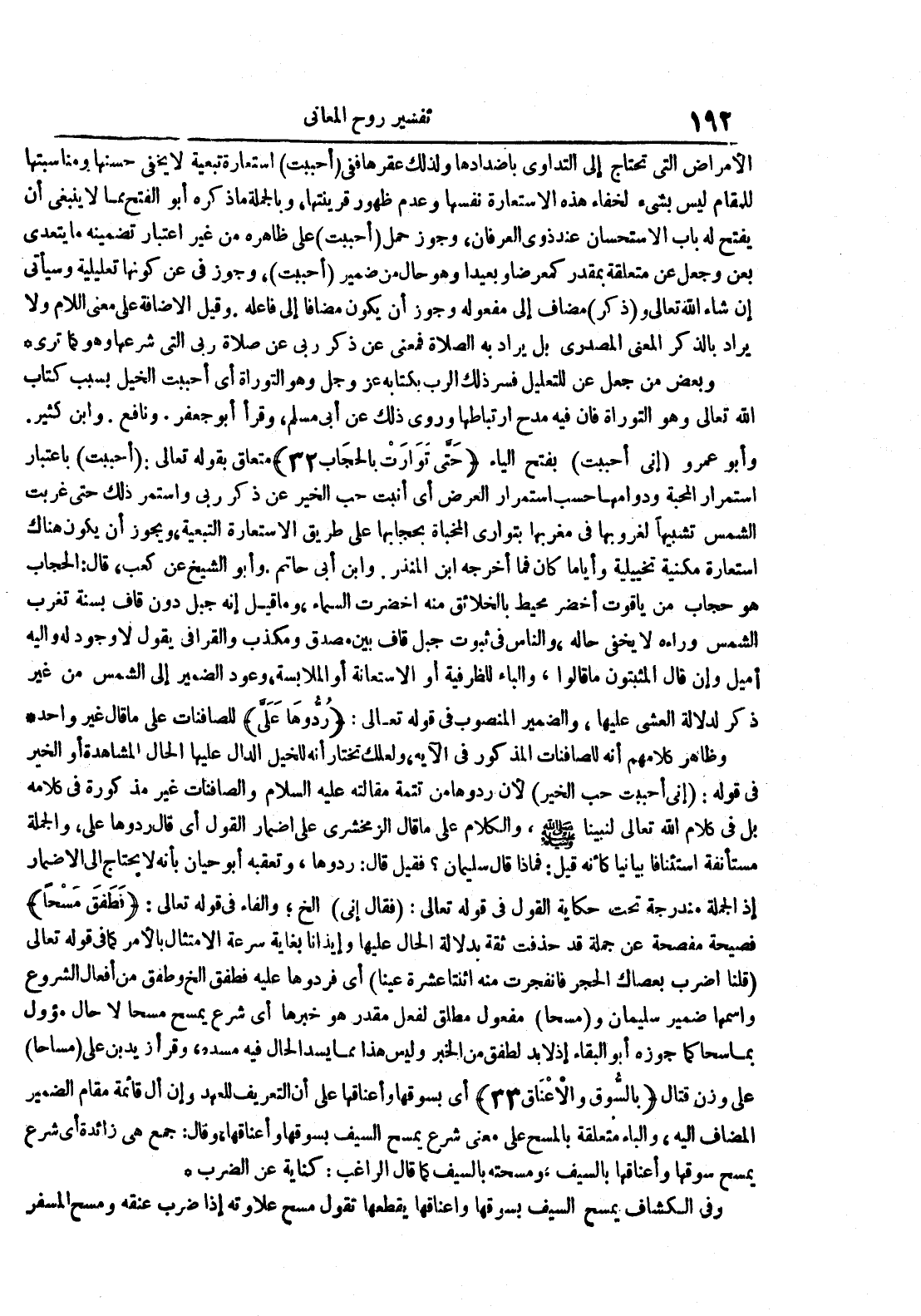 وبعض من جعل عن للتعليل فسر ذلك الرب بكتابه عز و جل وهو التوراة أي أحببت الخيل بسبب كتاب الله تعالى وهو التوراة فإن فيه مدح ارتباطها وروي ذلك عن أبي مسلم وقرأ أبو جعفر ونافع وابن كثير وذأبو عمرو إني أحببت بفتح الياء حتى توارت بالحجاب