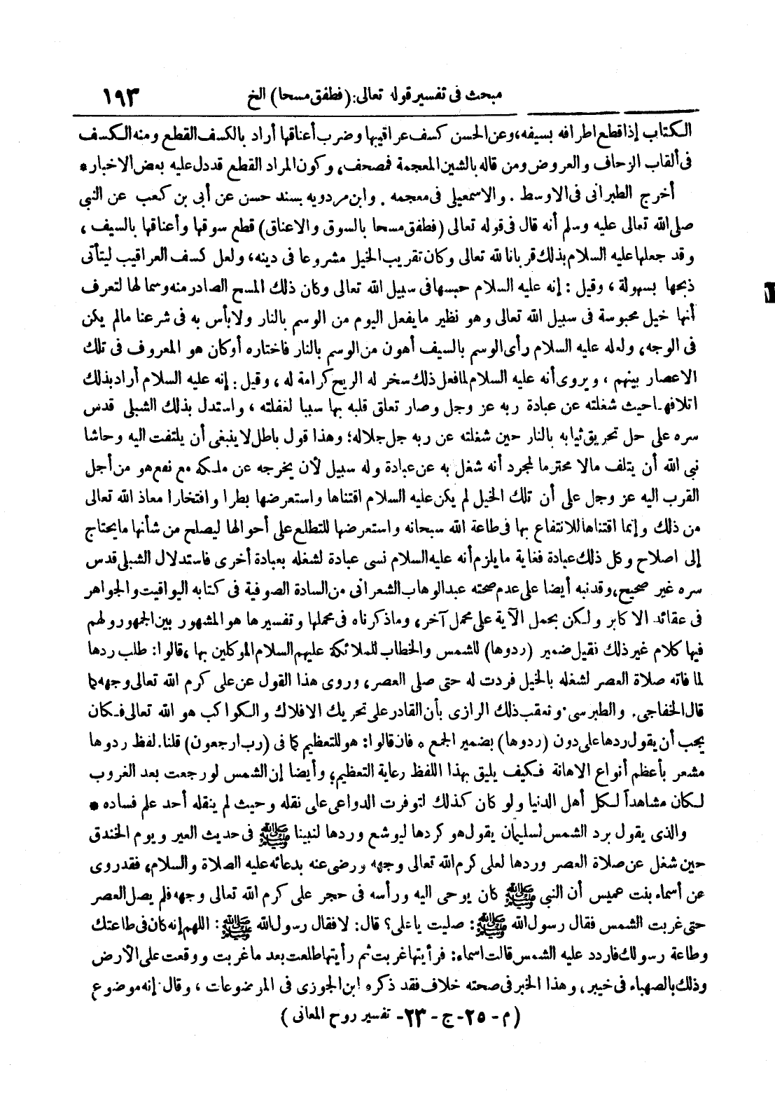 أخرج الطبراني في الأوسط والإسماعيلي في معجمه وابن مردويه بسند حسن عن أبي بن كعب عن النبي صلى الله تعالى عليه وسلم أنه قال في قوله تعالى فطفق مسحا بالسوق والأعناق قطع سوقها وأعناقها بالسيف وقد جعلها عليه السلام بذلك قربانا لله تعالى وكان تقريب الخيل مشروعا في دينه ولعل كسف العراقيب ليتأتى ذبحها بسهولة وقيل : إنه عليه السلام حسبها في سبيل الله تعالى وكان ذلك المسح الصادر منه وسمالها لتعرف أنها خيل محبوسة في سبيل الله تعالى وهو نظير ما يفعل اليوم من الوسم بالنار ولا بأس به في شرعنا مالم يكن في الوجه ولعله عليه السلام رأى الوسم بالسيف أهون من الوسم بالنار فاختاره أو كان هو المعروف في تلك الأعصار بينهم ويروى أنه عليه السلام لما فعل ذلك سخر له الريح كرامة له وقيل : إنه عليه السلام أراد بذلك إتلافها حيث شغلته عن عبادة ربه عز و جل وصار تعلق قلبه بها سببا لغفلته واستدل بذلك الشبلي قدس سره على حل تحريق ثيابه بالنار حين شغلته عن ربه جل جلاله وهذا قول باطل لا ينبغي أن يلتفت إليه وحاشا نبي الله أن يتلف مالا محترما لمجرد أنه شغل به عن عبادة وله سبيل لأن يخرجه عن ملكه مع نفع هو من أجل القرب إليه عز و جل على أن تلك الخيل لم يكن عليه السلام اقتناها واستعرضها بطرا وافتخارا معاذ الله تعالى من ذلك وإنما اقتناها للإنتفاع بها في طاعة الله سبحانه واستعرضها للتطلع على أحوالها ليصلح من شأنها ما يحتاج إلى إصلاح وكل ذلك عيادة فغاية ما يلزم أنه عليه السلام نسي عبادة لشغله بعبادة أخرى فاستدلال الشبلي قدس سره غير صحيح وقد نبه على عدم صحته عبد الوهاب الشعراني من السادة الصوفية في كتابه اليواقيت والجواهر في عقائد الأكابر ولكن يحمل الآية على محمل آخر وما ذكرناه في محملها وتفسيرها هو المشهور بين الجمهور لهم فيها كلام غير ذلك فقيل ضمير ردوها للشمس والخطاب للملائكة عليهم السلام الموكلين بها قالوا : طلب ردها لما فاته صلاة العصر لشغله بالخيل فردت له حتى صلى العصر وروي هذا القول عن علي كرم الله تعالى وجهه كما قال الخفاجي والطبرسي وتعقب ذلك الرازي بأن القادر على تحريك الأفلاك والكواكب هو الله تعالى فكان يجب أن يقول ردها علي دون ردوها بضمير الجمع
