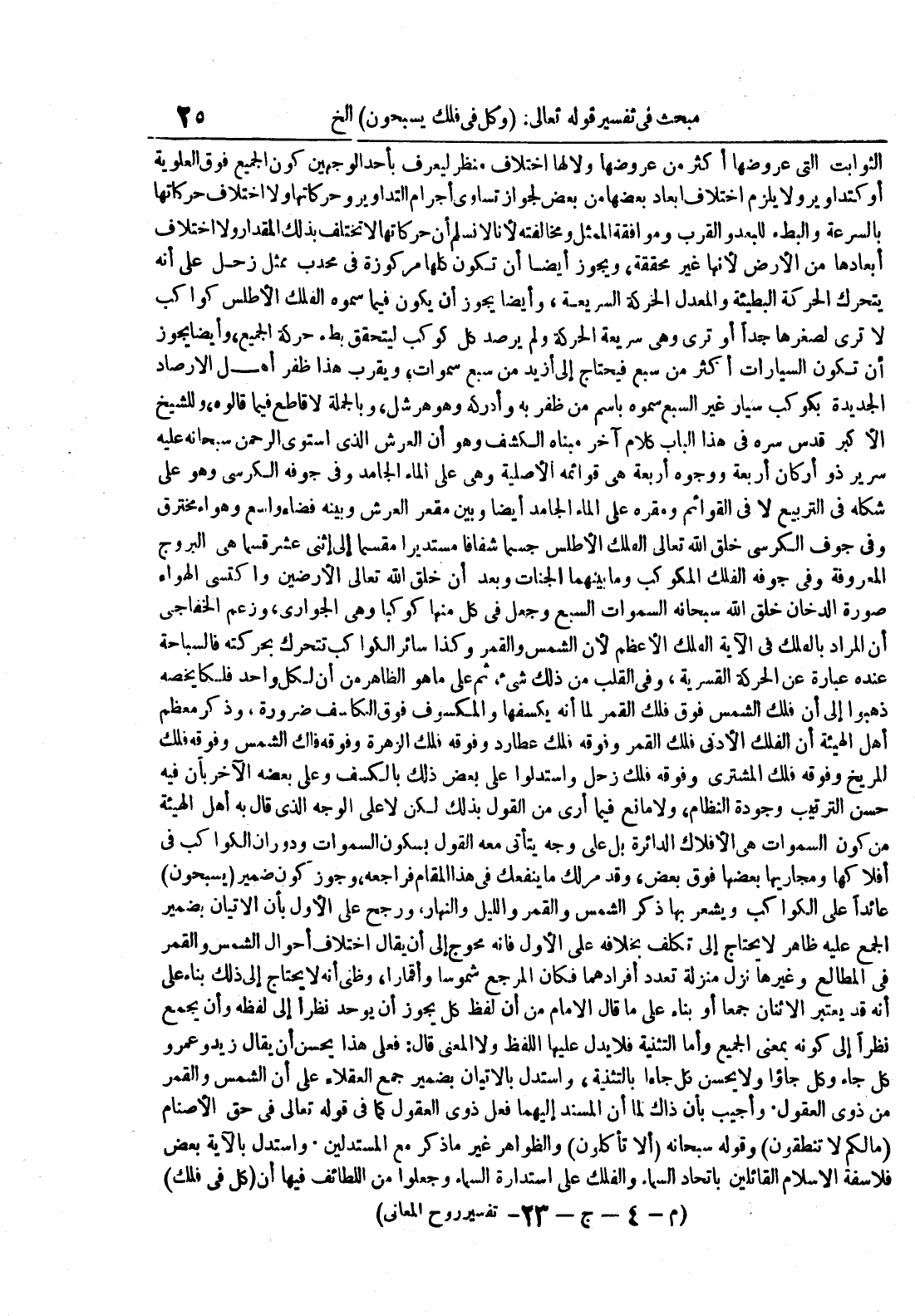 الثوابت التي عروضها أكثر من عروضها ولا لها اختلاف منظر ليعرف بأحد الوجهين كون الجميع فوق العلوية أو كتداوير ولا يلزم اختلاف أبعاد بعضها من بعض لجواز تساوي أجرام التداوير وحركاتها ولااختلاف حركاتها بالسرعة والبطء للبعد والقرب وموافقة الممثل ومخالفته لأنا لا نسلم أن حركتها لا تختلف بذلك المقدار ولا اختلاف أبعادها من الأرض لأنها غير محققة ويجوز أيضا أن تكون كلها مركوزة في محدب ممثل زحل على أنه يتحرك الحركة البطيئة والمعدل الحركة السريعة وأيضا يجوز أن يكون فيما سموه الفلك الأطلس كواكب لا ترى لصغرها جدا أو ترى وهي سريعة الحركة ولم يرصد كل كوكب ليتحقق بطء حركة الجميع وأيضا يجوز أن تكون السيارات أكثر من سبع فيحتاج إلى أزيد من سبع سماوات ويقرب هذا ظفر أهل الأرصاد الجديدة بكوكب سيار غير السبع سموه باسم من ظفر به وأدركه وهو هرشل وبالجملة لا قاطع فيما قالوه وللشيخ الأكبر قدس سره في هذا الباب كلام آخر مبناه الكشف وهو أن العرش الذي استوى الرحمن سبحانه عليه سرير ذو أركان أربعة ووجوه أربعة هي قوائمه الأصلية وهي على الماء الجامد وفي جوفه الكرسي وهو على شكله في التربيع لا في القوائم ومقره على الماء الجامد أيضا وبين مقعر العرش وبينه فضاء واسع وهواء مخترق وفي جوف الكرسي خلق الله تعالى الفلك الأطلسي جسما شفافا مستديرا مقسما إلى اثني عشر قسما هي البروج المعروفة وفي جوفه الفلك المكوكب وما بينهما الجنات وبعد أن خلق الله تعالى الأرضين واكتسى الهواء صورة الدخان خلق الله سبحانه السماوات السبع وجعل في كل منها كوكبا وهي الجواري وزعم الخفاجي أن المراد بالفلك في الآية الفلك الأعظم لأن الشمس والقمر وكذا سائر الكواكب تتحرك بحركته فالسباحة عنده عبارة عن الحركة القسرية وفي القلب من ذلك شيء ثم على ما هو الظاهر من أن لكل واحد فلكا يخصه ذهبوا إلى أن فلك الشمس فوق فلك القمر لما أنه يكسفها والمكسوف فوق الكاسف ضرورة وذكر معظم أهل الهيئة أن الفلك الأدنى فلك القمر وفوقه فلك عطارد وفوقه فلك الزهرة وفوقه فلك الشمس وفوقه فلك المريخ وفوقه فلك المشتري وفوقه فلك زحل واستدلوا على بعض ذلك بالكسف وعلى بعضه الآخر بأن فيه حسن الترتيب وجودة النظام ولا مانع فيما أرى من القول بذلك لكن لا على الوجه الذي قال به أهل الهيئة من كون السماوات هي الأفلاك الدائرة بل على وجه يتأتى معه القول بسكون السماوات ودوران الكواكب في أفلاكها ومجاريها بعضها فوق بعض وقد مر لك ما ينفعك في هذا المقام فراجعه وجوز كون ضمير يسبحون عائدا على الكواكب ويشعر بها ذكر الشمس والقمر والليل والنهار ورجح على الأول بأن الإتيان بضمير الجمع عليه ظاهر لا يحتاج إلى تكلف بخلافه على الأول فإنه محوج إلى أن يقال اختلاف أحوال الشمس والقمر في المطالع وغيرها نزل منزلة تعدد أفرادهما فكان المرجع شموسا وأقمارا وظني أنه لا يحتاج إلى ذلك بناء على أنه قد يعتبر الإثنان جمعا أو بناء على ما قال الإمام من أن لفظ كل يجوز أن يوحد نظرا إلى لفظه وأن يجمع نظرا إلى كونه بمعنى الجميع وأما التثنية فلا يدل عليها اللفظ ولا المعنى قال : فعلى هذا يحسن أن يقال زيد وعمرو كل جاء وكل جاؤا ولا يحسن كل جاءا بالتثنية واستدل بالإتيان بضمير جمع العقلاء على أن الشمس والقمر من ذوي العقول وأجيب بأن ذاك لما أن المسند إليهما فعل ذوي العقول كما في قوله تعالى في حق الأصنام ما لكم لا تنطقون وقوله سبحانه ألا تأكلون والظواهر غير ما ذكر مع المستدلين واستدل بالآية بعض فلاسفة الإسلام القائلين باتحاد السماء والفلك على استدارة السماء وجعلوا من اللطائف فيها أن كل في فلك