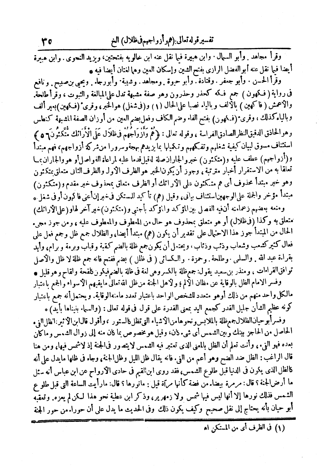 - استئناف مسوق لبيان كيفية شغلهم وتفكههم وتكميلها بما يزيدهم بهجة وسرورا من شركة أزواجهم فهم مبتدأ و أزواجهم عطف عليه و متكئون خبر والجار أن صلة له قيل قدما عليه لمراعاة الفواصل أو هو والجار أن بما تعلقا به من الإستقرار أخبار مترتبة وجوز أن يكون الخبر هو الظرف الأول والظرف الثاني متعلق بمتكئون وهو خبر مبتدأ محذوف أي هم متكئون على الأرائك أو الظرف متعلق بمحذوف خبر مقدم و متكئون مبتدأ مؤخر والجملة على الوجهين استئناف بياني وقيل هم تأكيد للمستكن في خبر إن أعني فاكهون أو في شغل