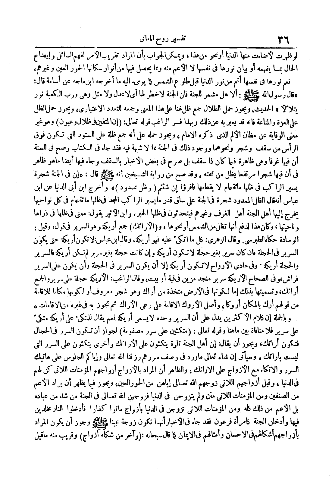 نعم نورها في نفسها أتم من نور الدنيا قبل طلوع الشمس كما يوميء إليه ما أخرجه ابن ماجه عن أسامة قال : قال رسول الله صلى الله عليه و سلم : ألا هل مشمر للجنة فإن الجنة لا خطر لها أي لا عدل ولا مثل وهي ورب الكعبة نور يتلألأ الحديث ويجوز حمل الظلال جمع ظل هنا على هذا المعنى وجمعه للتعدد الإعتباري ويجوز حمل الظل على العزة والمناعة فإنه قد يعبر به عن ذلك وبهذا فسر الراغب قوله تعالى : إن المتقين في ظلا وعيون وهو غير معنى الوقاية عن مظان الألم الذي ذكره الإمام ويجوز حمله على أنه جمع ظلة على الستور التي تكون فوق الرأس من سقف وشجر ونحوهما ووجود ذلك في الجنة مما لا شبهة فيه فقد جاء في الكتاب وصح في السنة أن فيها غرفا وهي ظاهرة فيما كان ذا سقف بل صرح في بعض الأخبار بالسقف وجاء فيها أيضا ما هو ظاهر في أن فيها شجرا مرتفعا يظل من تحته وقد صح من رواية الشيخين أنه صلى الله عليه و سلم قال : إن في الجنة شجرة يسير الراكب في ظلها مائة عام ولا يقطعها فاقرؤا إن شئتم وظل ممدود وأخرج ابن أبي الدنيا عن ابن عباس أنه قال الظل الممدود شجرة في الجنة على ساق قدر ما يسير الراكب المجد في ظلها مائة عام في كل نواحيها يخرج إليها أهل الجنة أهل الغرف وغيرهم فيتحدثون في ظلها الخبر وابن الأثير يقول : معنى في ظلها في ذراها وناحيتها وكان هذا لدفع أنها تظل من الشمس أو نحوها و الأرائك جمع أريكة وهو السرير في قول وقيل : الوسادة حكاه الطبرسي وقال الزهري : كل ما أتكيء عليه فهو أريكة وقال ابن عباس لا تكون أريكة حتى يكون السرير في الحجلة فإن كان سرير بغير حجلة لا تكون أريكة وإن كانت حجلة بغير سرير لم تكن أريكة فالسرير والحجلة أريكة وفي حادي الأرواح لا تكون أريكة إلا أن يكون السرير في الحجلة وأن يكون على السرير فراش وفي الصحاح الأريكة سرير منجد مزين في قبة أو بيت وقال الراغب : الأريكة حجلة على سرير والجمع آرائك وتسميتها بذلك إما لكونها في الأرض متخذة من أراك وهو شجر معروف أو لكوثها مكانا للإقامة من قولهم أرك بالمكان أروكا وأصل الأروك الإقامة على رعى الأراك ثم تجوز به في غيره من الإقامات