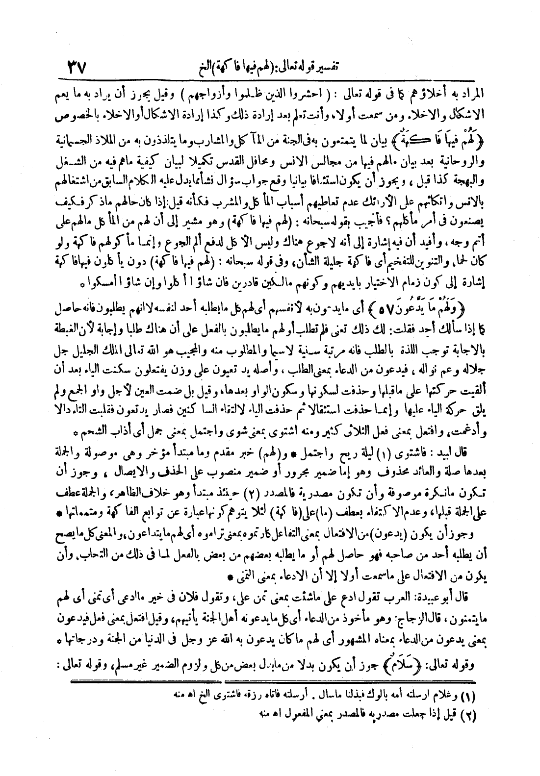 - أي ما يدعون به لأنفسهم أي لهم كل ما يطلبه أحد لنفسه لا أنهم يطلبون فإنه حاصل كما إذا سألك أحد فقلت : لك ذلك تعنى فلم تطلب أو لهم ما يطلبون بالفعل على أن هناك طلبا وإجابة لأن الغبطة بالإجابة توجب اللذة بالطلب فإنه مرتبة سنية لا سيما والمطلوب منه والمجيب هو الله تعالى الملك الجليل جل جلاله وعم نواله فيدعون من الدعاء بمعنى الطلب وأصله يدتعيون على وزن يفتعلون سكنت الياء بعد أن ألقيت حركتها على ما قبلها وحذفت لسكونها وسكون الواو بعدها وقيل بل ضمت العين لأجل واو الجمع ولم يلق حركة الياء عليها وإنما حذفت استثقالا ثم حذفت الياء لالتقاء الساكنين فصار يدتعون فقلبت التاء دالا وأدغمت وافتعل بمعنى فعل الثلاثي كثير ومنه اشتوى بمعنى شوى واجتمل بمعنى جمل أي اذاب الشحم