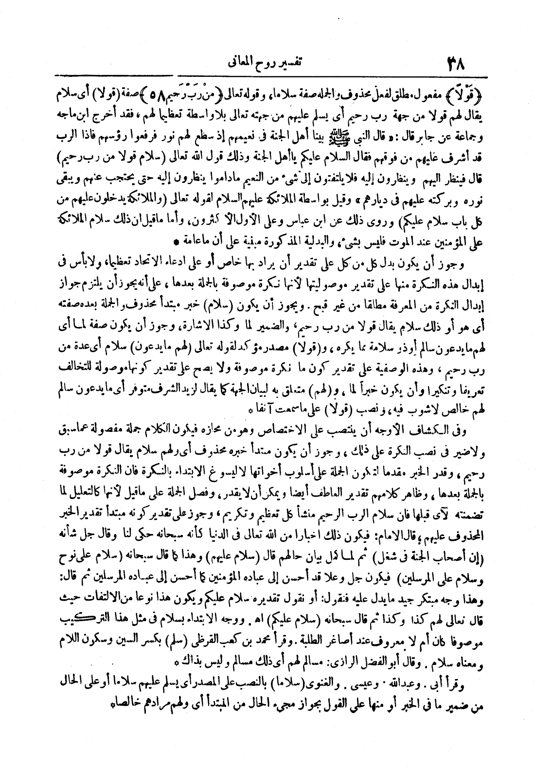 - صفة قولا أي سلام يقال لهم قولا من جهة رب رحيم أي يسلم عليهم من جهته تعالى بلا واسطة تعظيما لهم فقد أخرج ابن ماجة وجماعة عن جابر قال : قال النبي صلى الله عليه و سلم بينا أهل الجنة في نعيمهم إذ سطع لهم نور فرفعوا رؤسهم فإذا الرب قد أشرف عليهم من فوقهم فقال السلام عليكم يا أهل الجنة وذلك قول الله تعالى سلام قولا من رب رحيم قال فينظر إليهم وينظرون إليه فلا يلتفتون إلى شيء من النعيم ماداموا ينظرون إليه حتى يحتجب عنهم ويبقي نوره وبركته عليهم في ديارهم وقيل بواسطة الملائكة عليهم السلام لقوله تعالى والملائكة يدخلون عليهم من كل باب سلام عليكم وروي ذلك عن ابن عباس وعلى الأول الأكثرون وأما ما قيل أن ذلك سلام الملائكة على المؤمنين عند الموت فليس بشيء والبداية المذكورة مبنية على ان ما عامة