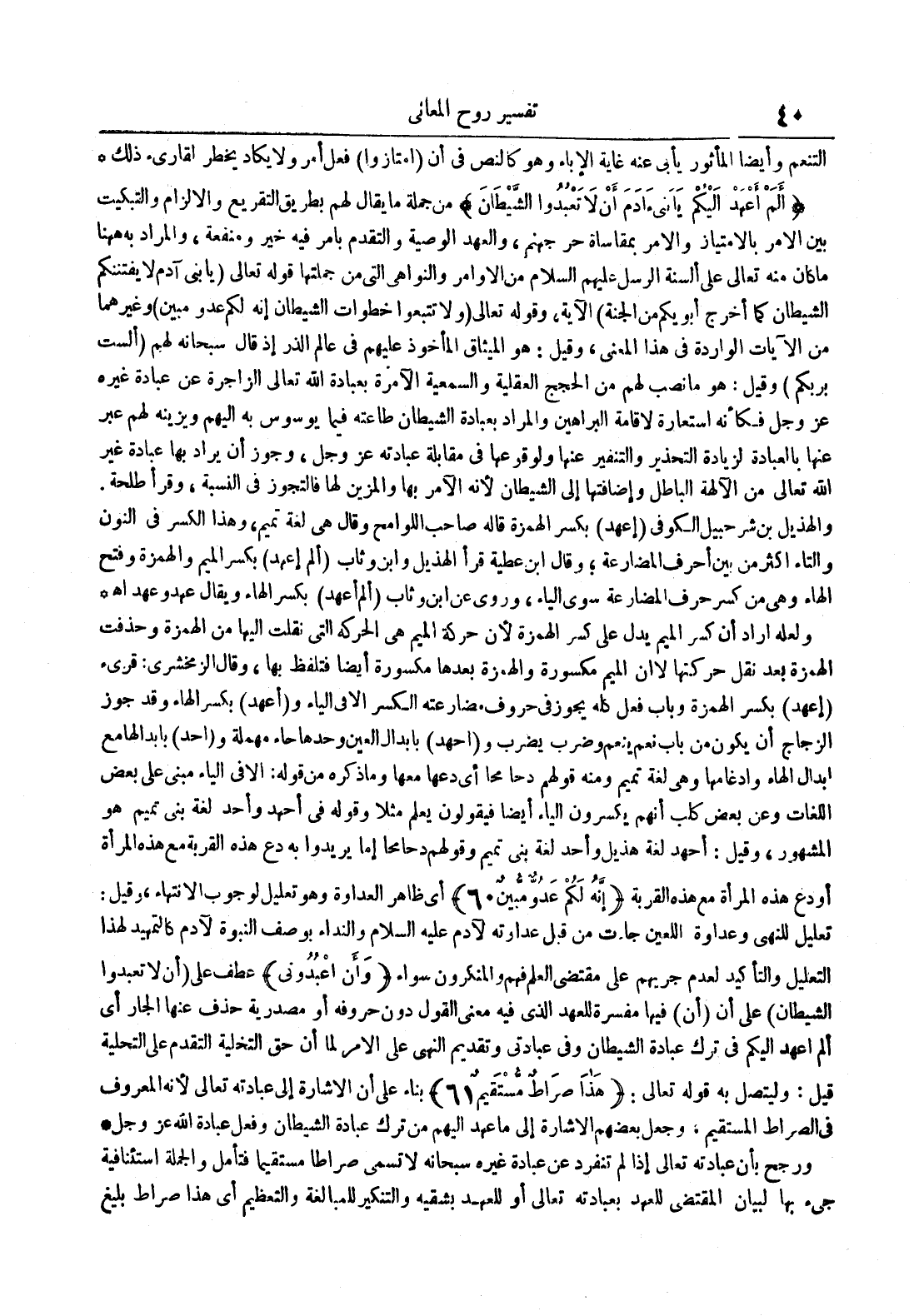 - أي ظاهر العداوة وهو تعليل لوجوب الإنتهاء وقيل : تعليل للنهي وعداوة اللعين جاءت من قبل عداوته لآدم عليه السلام والنداء بوصف النبوة لآدم كالتمهيد لهذا التعليل والتأكيد لعدم جريهم على مقتضى العلم فهم والمنكرون سواء وأن اعبدون عطف على أن لا تعبدوا الشيطان على أن أن فيها مفسرة للعهد الذي فيه معنى القول دون حروفه أو مصدرية حذف عنها الجار أي ألم أعهد إليكم في ترك عبادة الشيطان وفي عبادتي وتقديم النهي على الأمر لما أن حق التخلية التقديم على التحلية قيل : وليتصل به قوله تعالى : هذا صراط مستقيم