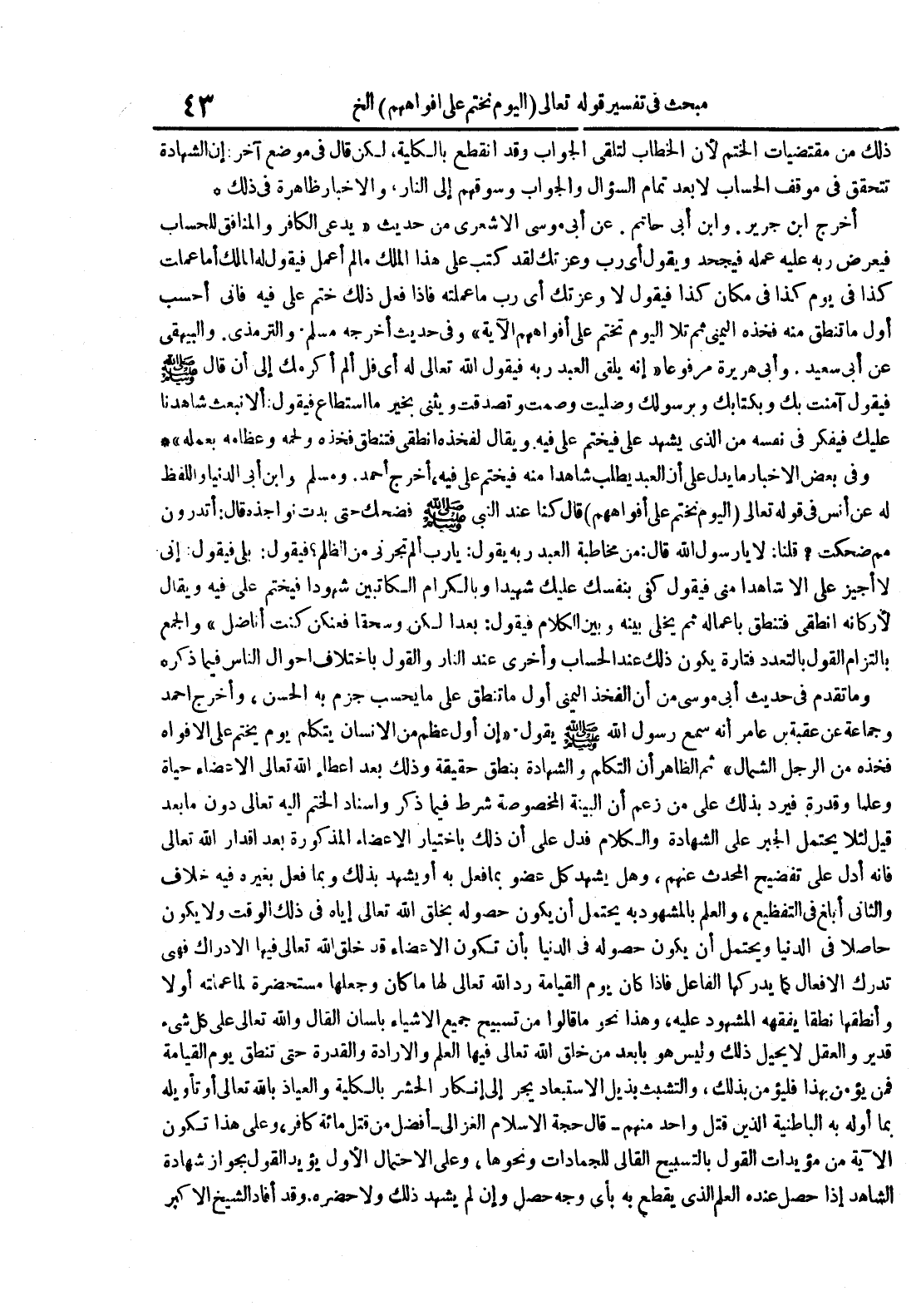 أخرج ابن جرير وابن أبي حاتم وعن أبي موسى الأشعري من حديث يدعى الكافر والمنافق للحساب فيعرض ربه عليه عمله فيجحد ويقول أي رب وعزتك لقد كنت على هذا الملك مالم أعمل فيقول له الملك أما عملت كذا في يوم كذا في مكان كذا فيقول لا وعزتك أي رب ما عملته فإذا فعل ذلك ختم على فيه فإني أحسب أول ما تنطق منه فخذه اليمنى ثم تلا اليوم نختم على أفواههم الآية وفي حديث أخرجه مسلم والترمذي والبيهي عن أبي سعيد وأبي هريرة مرفوعا إنه يلقى العبد ربه فيقول الله تعالى له أي قل ألم أمكرمك إلى أن قال صلى الله عليه و سلم فيقول آمنت بك وبكتابك وبرسولك وصليت وصمت وتصدقت ويثني بخير ما استطاع فيقول : ألا نبعث شاهدنا عليك فيفكر في نفسه من الذي يشهد علي فيختم على فيه ويقال لفخذه انطقي فتنطق فخذه ولحمه وعظامه بعمله
