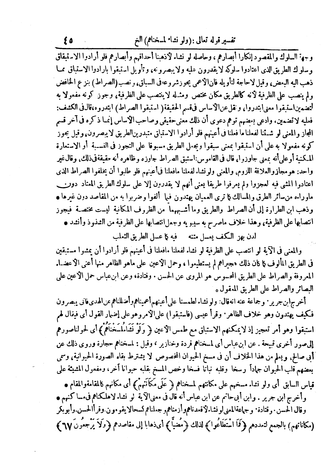 لدن بهز الكف يعسل متنه فيه كما عسل الطريق الثعلب والمعنى في الآية لو انتصب على الظرفية لو نشاء لفعلنا ما فعلنا في أعينهم فلو أرادوا أن يمشوا مستبقين في الطريق المألوف كما كان ذلك هجيرا هم لم يستطيعوا وحمل الأعين على ما هو الظاهر منها أعني الأعضاء المعروفة والصراط على الطريق المحسوس هو المروي عن الحسن وقتادة وعن ابن عباس حمل الأعين على البصائر والصراط على الطريق المعقول