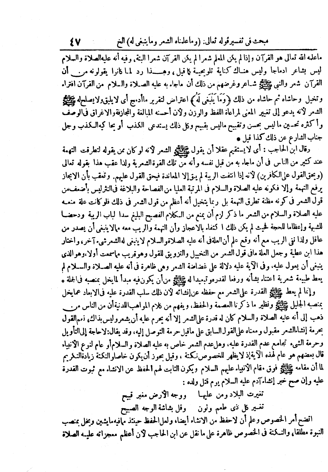 وقال ابن الحاجب : أي لا يستقيم عقلا أن يقول صلى الله عليه و سلم الشعر لأنه لو كان ممن يقوله لتطرقت التهمة عند كثير من الناس في أن ما جاء به من قبل نفسه وأنه من تلك القوة الشعرية ولذا عقب هذا بقوله تعالى ويحق القول على الكافرين لأنه إذا انتفت الريبة لم يبق إلا المعاندة فيحق القول عليهم وتعقب بأن الإيجاز يرفع التهمة وإلا فكونه عليه الصلاة و السلام في المرتبة العليا من الفصاحة والبلاغة في النثر ليس بأضعف من قول الشعر في كونه مظنة تطرق التهمة بل ربما يتخيل أنه أعظم من قول الشعر في ذلك فلو كانت علة منعه عليه الصلاة و السلام من الشعر ما ذكر لزم أن يمنع من الكلام الفصيح البليغ سدا لباب الريبة ودحضا للشبهة وإعظاما للحجة فحيث لم يكن ذلك اكتفاء بالإعجاز وأن التهمة والريب معه مما لا ينبغي أن يصدر من عاقل ولذا الريب مع أنه وقع أن العلة في أنه عليه الصلاة و السلام لا ينبغي له الشعر شيء آخر واختار هذا ابن عطية وجعل العلة ما في قول الشعر من التخييل والتزويق للقول وهو قريب مما سمعت أولا هو الذي ينبغي أن يعول عليه وفي الآية عليه دلالة على غضاضة الشعر وهي ظاهرة في أنه عليه الصلاة و السلام لم يعط طبيعة شعرية اعتناء بشأنه ورفعا لقدره وتبعيدا له صلى الله عليه و سلم من أن يكون فيه مبدأ لما يخل بمنصبه في الجملة