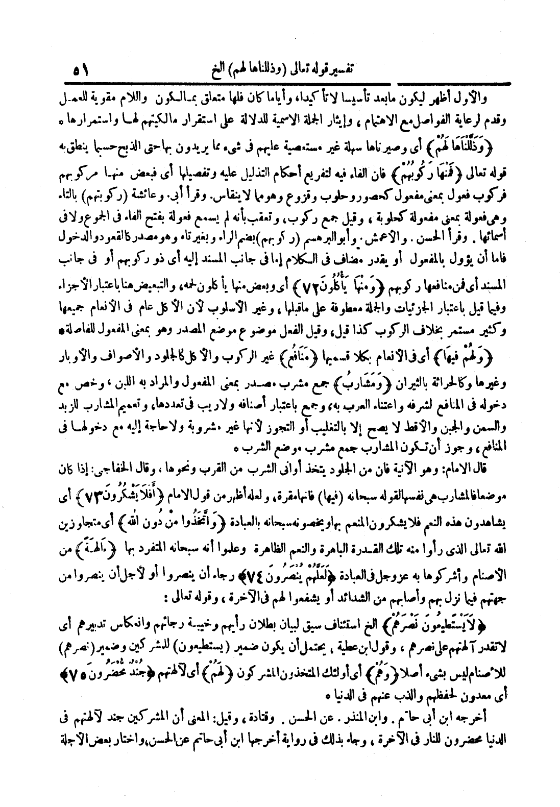 وذللناها لهم أي وصيرناها سهلة غير مستعصية عليهم في شيء مما يرديون بها حتى الذبح حسبما ينطق به قوله تعالى فمنها ركوبهم فإن الفاء فيه لتفريع أحكام التذليل عليه وتفصيلها أي فبعض منها مركوبهم فركوب فعول بمعنى مفعول كحصور وحلوب وقزوع وهو مما لا ينقاس وقرأ أبي وعائشة ركوبتهم بالتاء وهي فعولة بمعنى مفعولة كحلوبة وقيل جمع ركوب وتعقب بأنه لم يسمع فعولة بفتح الفاء في الجموع ولا في أسمائها وقرأ الحسن والأعمش وأبو البرهسم ركوبهم بضم الراء وبغير تاء وهو مصدر كالقعود والدخول فإما أن يؤول بالمفعول أو يقدر مضاف في الكلام إما في جانب المسند إليه أي ذو ركوبهم أو في جانب المسند فمن منافعها ركوبهم ومنها يأكلون
