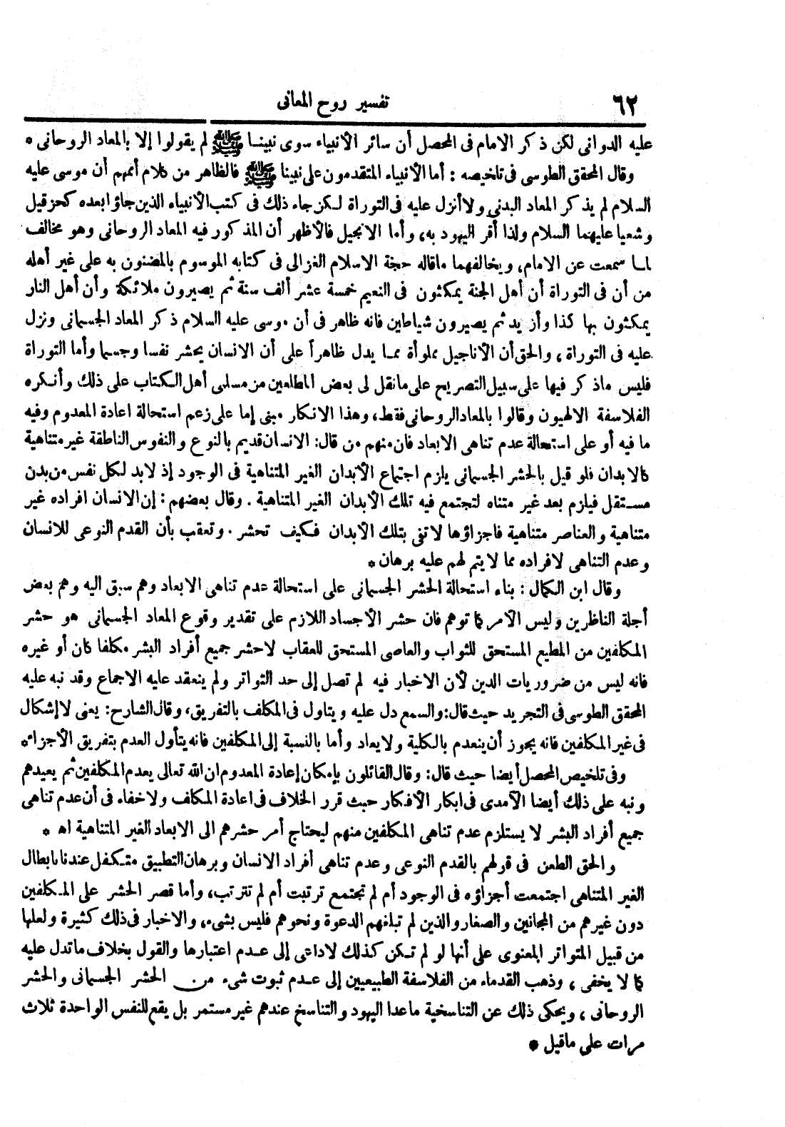 وقال المحقق الطوسي في تلخيصه : أما الأنبياء المتقدمون على نبينا صلى الله عليه و سلم فالظاهر من كلامهم أممهم أن موسى عليه السلام لم يذكر المعاد البدني ولا أنزل عليه في التوراة لكن جاء ذلك في كتب الأنبياء الذين جاؤا بعده كحزقيل وشعيا عليهما السلام ولذا أقر اليهود به وأما الإنجيل فالأظهر أن المذكور فيه المعاد الروحاني وهو مخالف لما سمعت عن الإمام ويخالفهما ما قاله حجة الإسلام الغزالي في كتابه الموسوم بالمضنون به على غير أهله من أن في التوراة أه أهل الجنة يمكثون في النعيم خمسة عشر ألف سنة ثم يصيرون ملائكة وأن أهل النار يمكثون بها كذت وأزيد ثم يصيرون شياطين فإنه ظاهر في أن موسى عليه السلام ذكر المعاد الجسماني ونزل عليه في التوراة والحق أن الأناجيل مملوأة مما يدل ظاهرا على أن الإنسان يحشر نفسا وجسما وأما التوراة فليس ما ذكر فيها على سبيل التصريح على ما نقل لي بعض المطلعين من مسلمي أهل الكتاب على ذلك وأنكره الفلاسفة الإلهيون وقالوا بالمعاد الروحاني فقط وهذا الإنكار مبني إما على زعم استحالة المعدوم وفيه ما فيه على استحالة عدم تناهي الأبعاد فإن منهم من قال : الإنسان قديم بالنوع والنفوس الناطقة غير متناهية كالأبدان فلو قيل بالحشر الجسماني يلزم اجتماع الأبدان الغير المتناهية في الوجود غذ لا بد لكل نفس من بدن مستقل فيلزم بعد غير متناه لتجتمع فيه تلك الأبدان الغير المتناهية وقال بعضهم : إن الإنسان إفراده غير متناهية والعناصر متناهية فأجزاؤها لا نفي الأبدان فكيف تحشر وتعقب بأن القدم النوعي للإنسان وعدم التناهي لإفراده مما لا يتم لهم عليه برهان