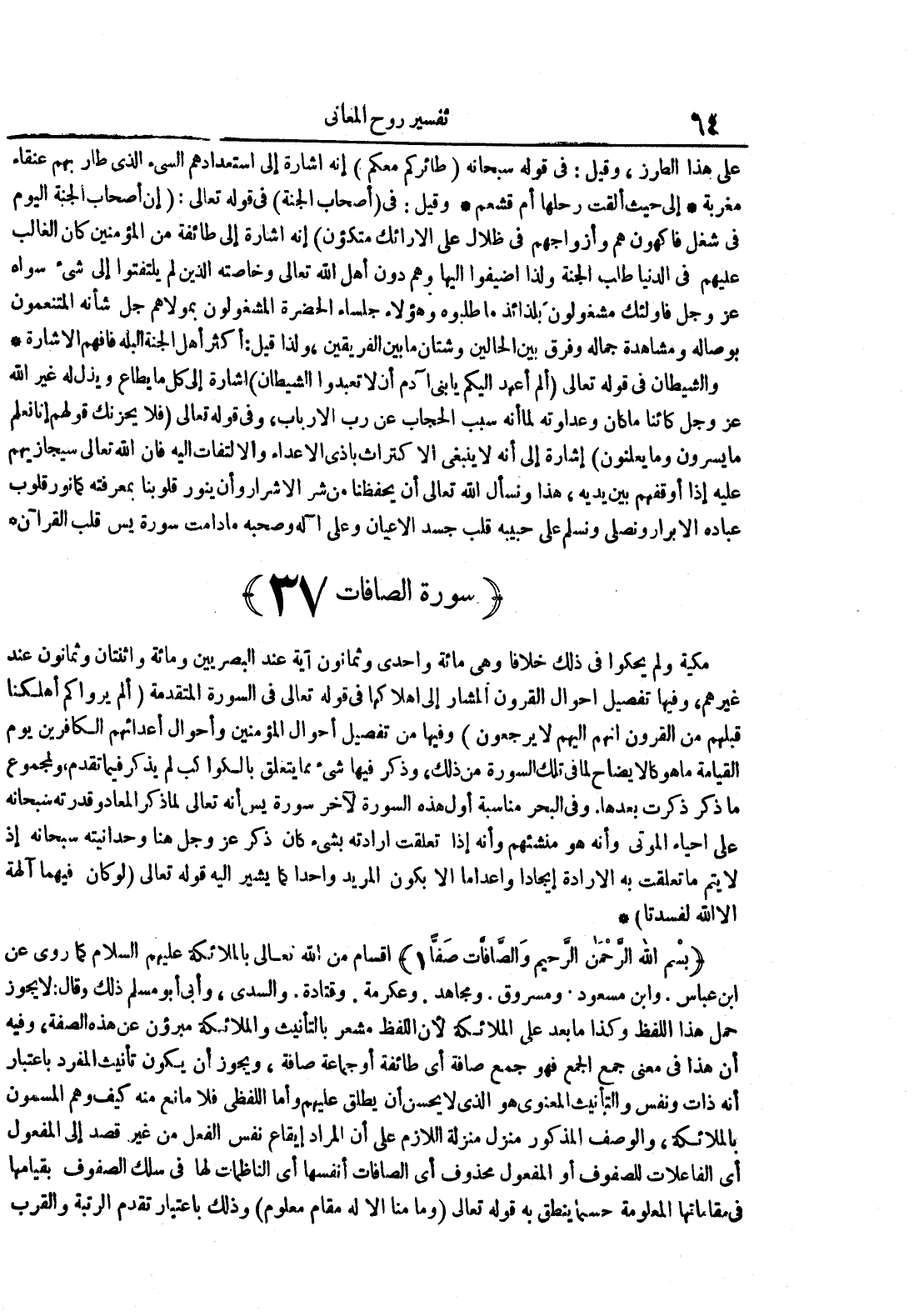 - إقسام من الله تعالى بالملائكة عليهم السلام كما روي عن ابن عباس وابن مسعود ومسروق ومجاهد وعكرمة وقتادة والسدي وأبي أبو مسلم ذلك وقال : لا يجوز حمل اللفظ وكذا ما بعد على الملائكة لأن اللفظ مشعر بالتأنيث والملائكة مبرؤن عن هذه الصفة وفيه أن هذا معنى جمع الجمع فهو جمع صافة أي طائفة أو جماعة صافة ويجوز أن يكون تأنيث المفرد باعتبار أنه ذات ونفس والتأنيث المعنوي هو الذي لا يحسن أن يطلق عليهم وأما اللفظي فلا مانع منه كيف وهم المسمون بالملائكة والوصف المذكور منزل منزلة اللازم على أن المراد إيقاع نفس الفعل من غير قصد إلى المفعول أي الفاعلات للصفوف أو المفعول محذوف أي الصافات أنفسها أي الناظمات لها في سلك الصفوف بقيامها في مقاماتها المعلومة حسبما ينطق به قوله تعالى وما منا إلا له مقام معلوم 9 وذلك باعتبار تقدم الرتبة والقرب