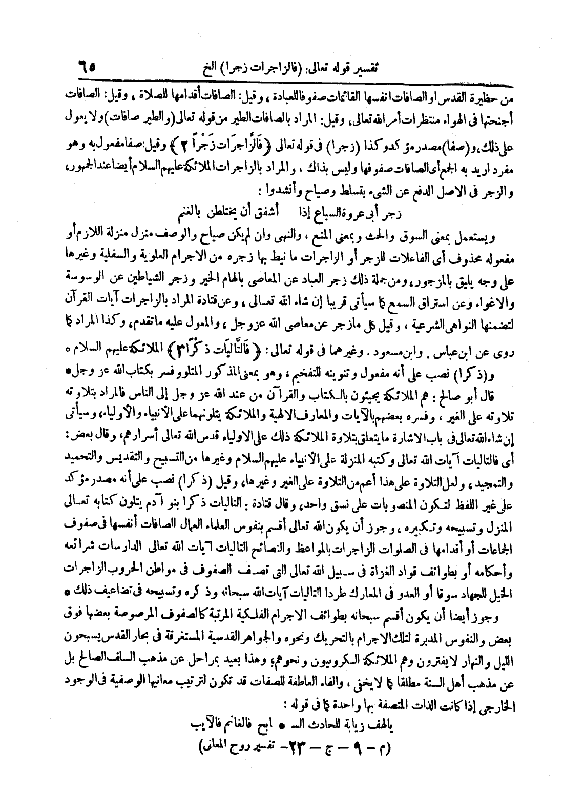 - وقيل : صفا مفعول به وهو مفرد أريد به الجمع أي الصافات صفوفها وليس بذاك والمراد بالزاجرات الملائكة عليهم السلام أيضا عند الجمهور والزجر في الأصل الدفع عن الشيء بتسلط وصياح وأنشدوا : زجر أبي عروة السباع إذا أشفق أن يختلطن بالغنم ويستعمل بمعنى السوق والحث وبمعنى المنع والنهي وإن لم يكن صياح والوصف منزل منزلة اللازم أو مفعوله محذوف أي الفاعلات للزجر أو الزاجرات ما نيط بها زجره من الأجرام العلوية والسفلية وغيرها على وجه يليق بالمزجور ومن جملة ذلك زجر العباد عن المعاصي بإلهام الخير وزجر الشياطين عن الوسوسة والإغواء وعن استراق السمع كما سيأتي قريبا إن شاء الله تعالى وعن قتادة المراد بالزاجرات آيات القرآن لتضمنها النواهي الشرعية وقيل كل ما زجر عن معاصي الله عز و جل والمعول عليه ما تقدم وكذا المراد كما روي عن ابن عباس وابن مسعود وغيرهما في قوله تعالى : فالتاليات ذكر