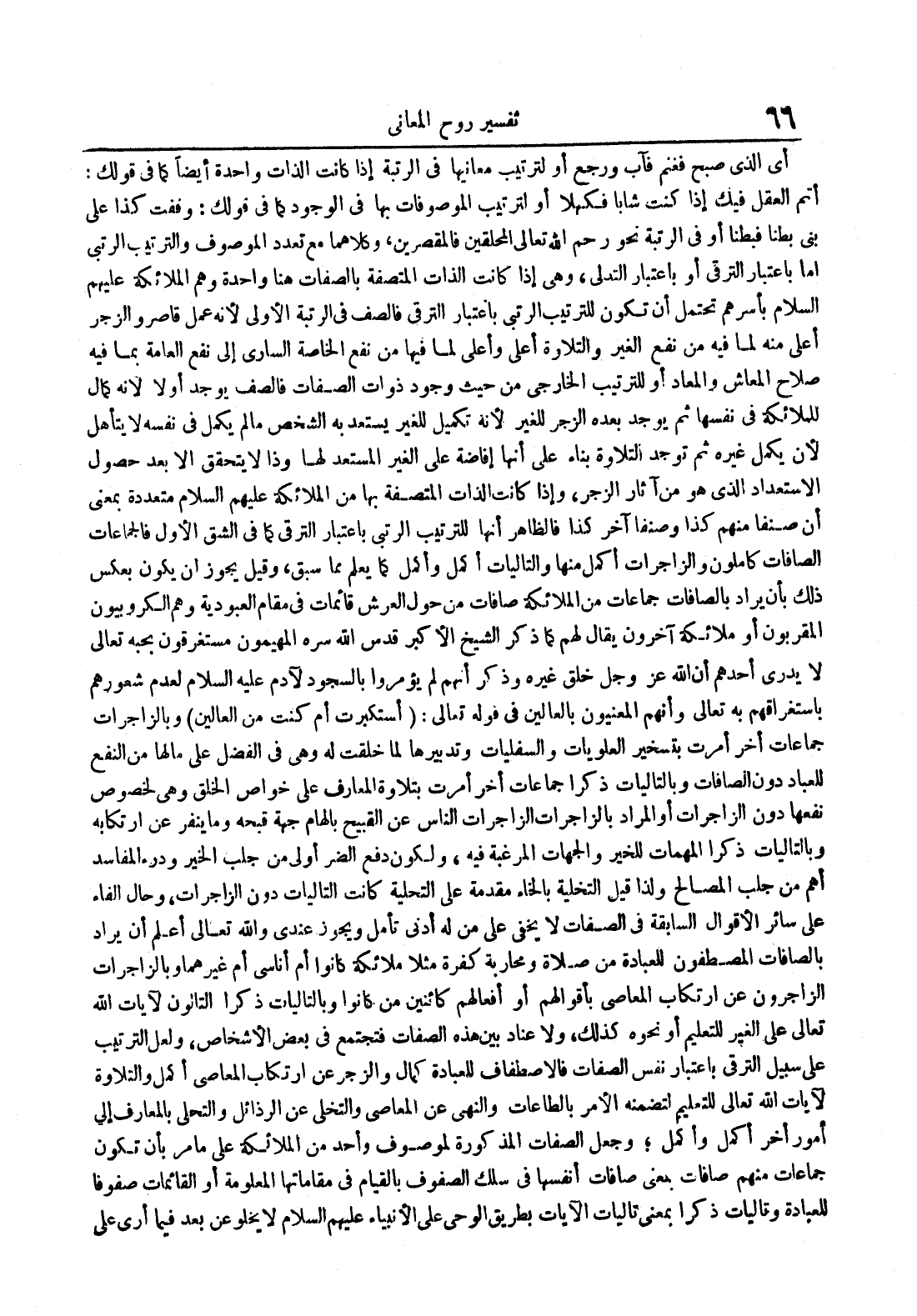 أي الذي صبح فغنم فآب ورجع أو لترتيب معانيها في الرتبة إذا كانت الذات واحدة أيضا كما في قولك : أتم العقل فيك إذا كنت شابا فكهلا أو لترتيب الموصوفات بها في الوجود كما في قولك : وقفت كذا على بني بطنا فبطنا أو في الرتبة نحو رحم الله تعالى المحلقين فالمقصرين وكلاهما مع تعدد الموصوف والترتيب الرتبي إما باعتبار الترقي أو باعتبار التدلي وهي إذا كانت الذات المتصفة بالصفات هنا واحدة وهم الملائكة عليهم السلام بأسرهم تحتمل أن تكون للترتيب الرتبي باعتبار الترقي فالصف في الرتبة الأولى لأنه عمل قاصر والزجر أعلى منه لما فيه من نفع الغير والتلاوة أعلى لما فيها من نفع الخاصة الساري إلى نفع العامة بما فيه صلاح المعاش والمعاد أو للترتيب الخارجي من حيث وجود ذوات الصفات فالصف يوجد أولا لأنه كمال للملائكة في نفسها ثم يوجد بعده الزجر للغير لأنه تكميل للغير يستعد به الشخص مالم يكن في نفسه لا يتأهل لأن يكمل غيره ثم توجد التلاوة بناء على أنها إفاضة على الغير المستعد لها وذا لا يتحقق إلا بعد حصول الإستعداد الذي هو من آثار الزجر وإذا كانت الذات المتصفة بها من الملائكة عليهم السلام متعددة بمعنى أن صنفا منهم كذا وصنفا آخر كذا فالظاهر أنها للترتيب الرتبي باعتبار الترقي كما في الشق الأول فالجماعات الصافات كاملون والزاجرات أكمل منها والتاليات أكمل وأكمل كما يعلم مما سبق وقيل يجوز أن يكون بعكس ذلك بأن يراد بالصافات جماعات من الملائكة صافات من حول العرش قائمات في مقام العبودية وهم الكروبيون المقربون أو ملائكة آخرون يقال لهم كما ذكر الشيخ الأكبر قدس سره المهيمون مستغرقون بحبه تعالى لا يدري أحدهم أن الله عز و جل خلق غيره وذكر أنهم لم يؤمروا بالسجود لآدم عليه السلام لعدم شعورهم باستغراقهم به تعالى وأنهم المعنيون بالعالين في قوله تعالى : أستكبرت أم كنت من العالين وبالزاجرات جماعات أخر أمرت بتسخير العلويات والسفليات وتدبيرها لما خلقت له وهي في الفضل على ما لها من النفع للعباد دون الصافات وبالتاليات ذكرا جماعات أخر أمرت بتلاوة المعارف على خواص الخلق وهي لخصوص نفعها دون الزاجرات أو المراد بالزاجرات الزاجرات الناس عن القبيح بالهام جهة قبحه وما ينفر عن ارتكابه وبالتاليات ذكرا المهمات للخير والجهات المرغبة فيه ولكون دفع الضر أولى من جلب الخير ودرء المفاسد أهم من جلب المصالح ولذا قيل التخلية بالخاء مقدمة على التحلية كانت التاليات دون الزاجرات وحال الفاء على سائر الأقوال السابقة في الصفات لا يخفى على من له أدنى تأمل ويجوز عندي والله تعالى أعلم أن يراد بالصفات المصطفون ببعبادة من صلاة ومحاربة كفرة مثلا ملائكة كانوا أم أناسي أم غيرهما وبالزاجرات الزاجرون على ارتكاب المعاصي بأقوالهم أو أفعالهم كائنين من كانوا وبالتاليات ذكرا التالون لآيات الله تعالى على الغير للتعليم أو نحوه كذلك ولا عناد بين هذه الصفات فتجمع في بعض الأشخاص ولعل الترتيب على سبيل الترقي باعتبار نفس الصفات فالإصطفاف للعبادة كمال والزجر عن ارتكاب المعاصي أكمل والتلاوة لآيات الله تعالى للتعليم لتضمنه الأمر بالطاعات والنهي عن المعاصي والتخلي عن الرذائل والتحلي بالمعارف إلى أمور أخر أكمل وأكمل وجعل الصفات المذكورة لموصوف وأحد من الملائكة على ما مر بأن تكون جماعات منهم صافات بمعنى صافات أنفسها في سلك الصفوف بالقيام في مقاماتها المعلومة أو القائمات صفوفا للعبادة وتاليات ذكرا بمعنى تاليات الآيات بطريق الوحي على الأنبياء