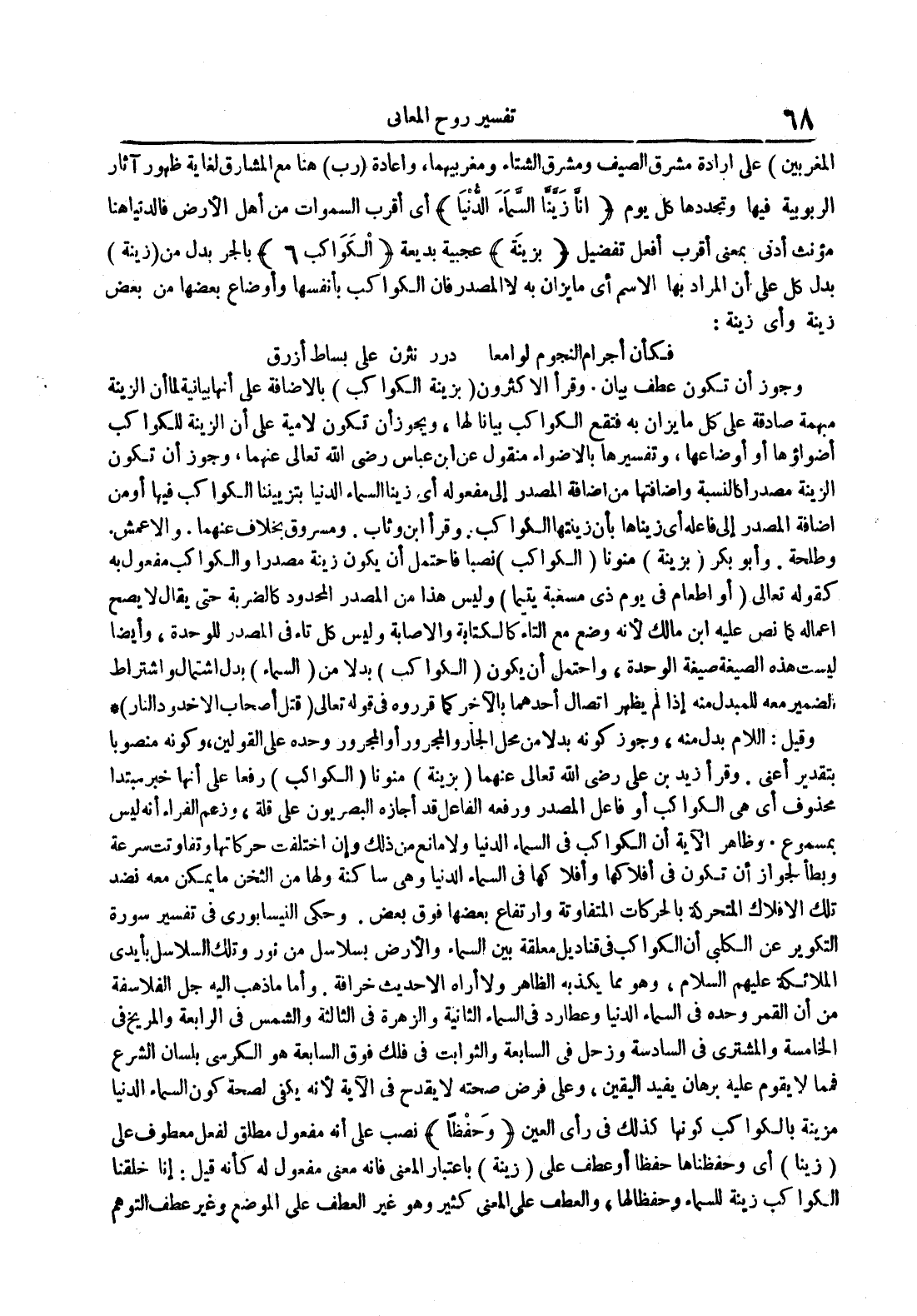 - بالجر بدل من زينة بدل كل على أن المراد بها الاسم أي ما يزان به لا المصدر فإن الكواكب بأنفسها وأوضاع بعضها من بعض زينة وأي زينة : فكأن أجرام النجوم لوامعا درر نثرن على بساط أزرق وجوز أن تكون عطف بيان وقرأ الأكثرون بزينة الكواكب بالإضافة على أنها بيانية لما أن الزينة مبهمة صادقة على كا ما يزان به فتقع الكواكب بيانا لها ويجوز أن تكون لامية على أن الزينة للكواكب أضواؤها أو أوضاعها وتفسيرها بالأضواء منقول عن ابن عباس رضي الله تعالى عنهما وجوز أن تكون الزينة مصدرا كالنسبة وإضافة المصدر إلى مفعوله أي زينا السماء الدنيا بتزييننا الكواكب فيها أو من إضافة المصدر إلى فاعله أي زيناها بأن زينتها الكواكب وقرأ ابن وثاب ومسروق بخلاف عنهما والأعمش وطلحة وأبو بكر بزينة منونا الكواكب نصبا فاحتمل أن يكون زينة مصدرا والكواكب مفعول به كقوله تعالى أو إطعام في يوم ذي مسغبة يتيما وليس هذا من المصدر المحدود كالضربة حتى يقال لا يصح أعماله كما نص عليه ابن مالك لأنه وضع مع التاء كالكتابة والإصابة وليس كل تاء في المصدر للوحدة وأيضا ليست هذه الصيغة صيغة الوحدة واحتمل أن يكون الكواكب بدلا من السماء بدل اشتمال واشتراط الضمير معه للمبدل منه إذا لم يظهر اتصال أحدهما بالآخر كما قرروه في قوله تعالى قتل أصحاب الأخدود النار