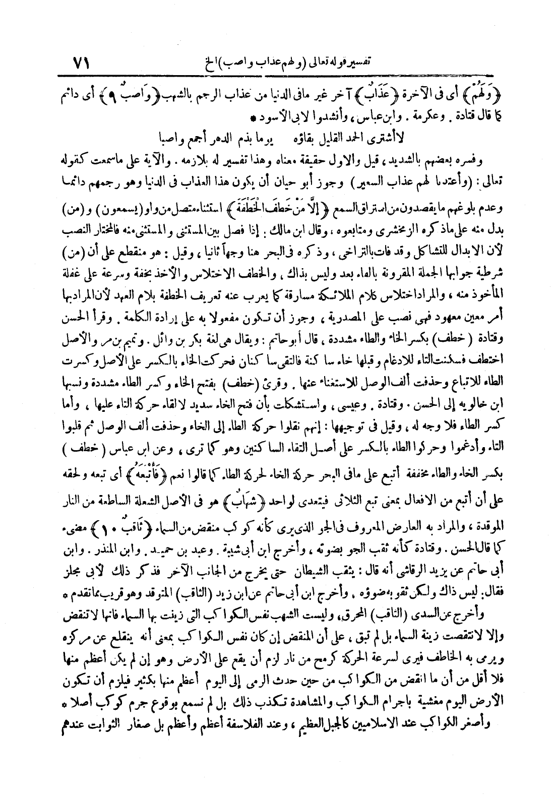 لا أشتري الحمد القليل بقاؤه يوما بذم الدهر أجمع واصبا وفسره بعضهم بالشديد وقيل والأول حقيقة معناه وهذا تفسير له بلازمه والآية على ما سمعت كقوله تعالى : وأعتدنا لهم عذاب السعير وجوز أبو حيان أن يكون هذا العذاب في الدنيا وهو رجمهم دائما وعدم بلوغهم ما يقصدون من استراق السمع إلا من خطف الخطفة استثناء متصل من واو يسمعون و من بدل منه على ما ذكره الزمخشري ومتابعوه وقال ابن مالك : إذا فصل بين المستثنى والمستثنى منه فالمختار النصب لأن الإبدال للتشاكل وقد فات بالتراخي وذكره في البحر هنا وجها ثانيا وقيل : هو منقطع على أن من شرطية جوابها الجملة المقرونة بالفاء بعد وليس بذاك والخطف الإختلاس والأخذ بخفة وسرعة على غفلة المأخوذ منه والمراد اختلاس كلام الملائكة مسارقة كما يعرب عنه تعريف الخطفة بلام العهد لأن المراد بها أمر معين معهود فهي نصب على المصدرية وجوز أن تكون مفعولا به على إرادة الكلمة وقرأ الحسن وقتادة خطف بكسر الخاء والطاء مشددة قال أبو حاتم : ويقال هي لغة بكر بن وائل وتميم بن مر والأصل اختطف فسكنت التاء للإدغام وقبلها خاء ساكنة فالتقى ساكنان فحركت الخاء بالكسر على الأصل وكسرت الطاء للإتباع وحذفت ألف الوصل للإستغناء عنها وقريء خطف بفتح الخاء وكسر الطاء مشددة ونسبها ابن خالويه إلى الحسن وقتادة وعيسى واستشكلت بأن فتح الخاء سديد لالقاء حركة التاء عليها وأما كسر الطاء فلا وجه له وقيل في توجيهها : إنهم نقلوا حركة الطاء إلى الخاء وحذفت ألف الوصل ثم قلبوا التاء وأدغموا وحركوا الطاء بالكسر على أصل التقاء الساكنين وهو كما ترى وعن ابن عباس خطف بكسر الخاء والطاء مخففة أتبع على ما في البحر حركة الخاء لحركة الطاء كما قالوا نعم فأتبعه أي تبعه ولحقه على أن أتبع من الأفعال بمعنى تبع الثلاثي فيتعدى لواحد شهاب هو في الأصل الشعلة الساطعة من النار الموقدة والمراد به العارض المعروف في الجو الذي يرى كأنه كوكب منقض من السماء ثاقب