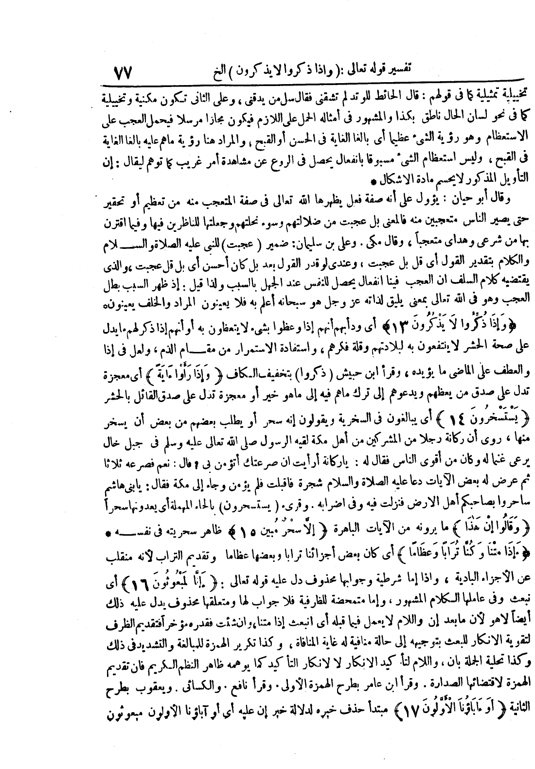 - أي ودأبهم أنهم إذا وعظوا بشيء لا يتعظون به أو أنهم إذا ذكر لهم ما يدل على صحة الحشر لا ينتفعون به لبلادتهم وقلة فكرهم واستفادة الإستمرار من مقام الذم ولعل في إذا والعطف على الماضي ما يؤيده وقرأ ابن حبيش ذكروا بتخفيف الكاف وإذا رأوا آية أي معجزة تدل على صدق من يعظهم ويدعوهم إلى ترك ما هم فيه إلى ما هو خير أو معجزة تدل على صدق القائل بالحشر يستسخرون