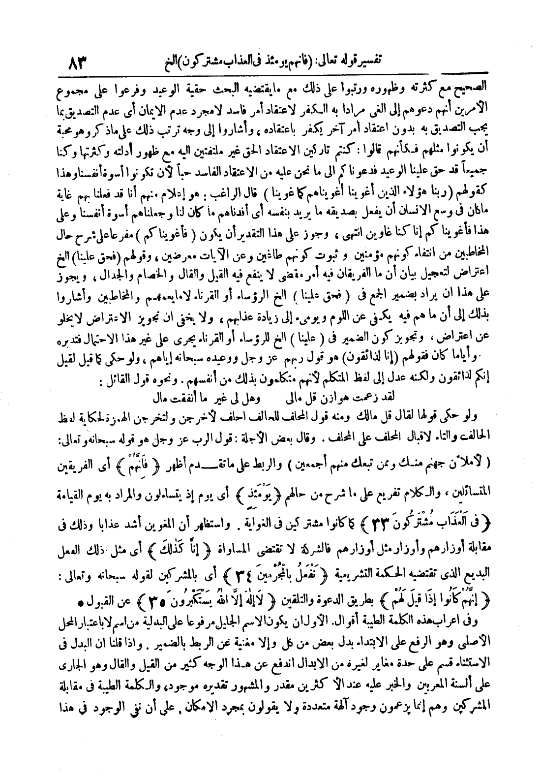 وأيا ما كان فقولهم إنا لذائقون هو قول ربهم عز و جل ووعيده سبحانه إياهم ولو حكى كما قيل لقيل إنكم لذائقون ولكنه عدل إلى لفظ المتكلم لأنهم متكلمون بذلك من أنفسهم ونحوه قول القائل : لقد زعمت هوازن قل مالي وهل لي غير ما أنفقت مال ولو حكي قولها لقال قل مالك ومنه قول المحلف للحالف احلف لأخرجن ولتخرجن الهمزة لحكاية لفظ الحالف والتاء لإقبال المحلف على المحلف وقال بعض الأجلة : قول الرب عز و جل هو قوله سبحانه وتعالى : لأملأن جهنم منك وممن تبعك منهم أجمعين والربط على ما تقدم أظهر فإنهم أي الفريقين المتسائلين والكلام تفريع على ما شرح من حالهم يومئذ أي يوم إذ يتساءلون والمراد به يوم القيامة في العذاب مشتركون