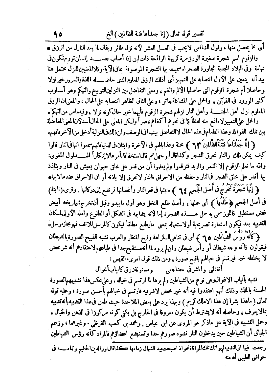 - منبتها في قعر النار وأغصانها ترتفع إلى دركاتها وقريء نابتة في أصل الجحيم طلعها أي حملها وأصله طلع النخل وهو أول ما يبدو وقبل أن تخرج شماريخه أبيض غض مستطيل كالموز سمي به حمل هذه الشجرة إما لأنه يشابه في الشكل أو الطلوع ولعله الأولى لمكان التشبيه بعد فيكون استعارة تصريحية أو لاستعماله بمعنى ما يطلع مطلقا فيكون كالمرسل للأنف فهو مجاز مرسل