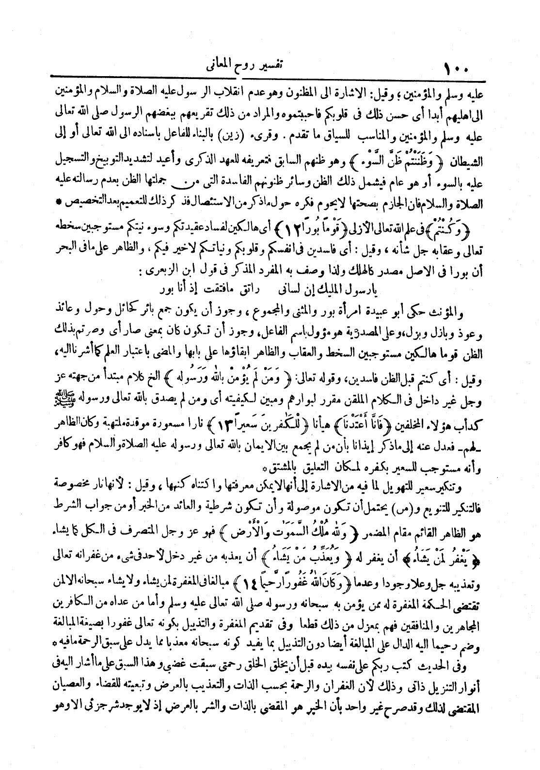 - أي هالكين لفساد عقيدتكم وسوء نيتكم مستوجبين سخطه تعالى وعقابه جل شأنه وقيل : أي فاسدين في أنفسكم وقلوبكم ونياتكم لا خير فيكم والظاهر على ما في البحر أن بورا في الأصل مصدر كالهلك ولذا وصف به المفرد المذكر في قول ابن الزبعري : يا رسول المليك إن لساني راتق ما فتقت إذ أنا بور والمؤنث حكى أبو عبيدة امرأة بور والمثنى والمجموع وجوز أن يكون جمع بائر كحائل وحول وعائد وعوذ وبازل وبزل وعلى المصدرية هو مؤول باسم الفاعل وجوز أن تكون كان بمعنى صار أي وصرتم بذلك الظن قوما هالكين مستوجبين السخط والعقاب والظاهر إبقاؤها على بابها والمضي باعتبار العلم كما أشرنا إليه وقيل : أي كنتم قبل الظن فاسدين وقوله تعالى : ومن لم يؤمن بالله ورسوله الخ كلام مبتدأ من جهته عز و جل وجل غير داخل في الكلام الملقن مقرر لبوارهم ومبين لكيفيته أي ومن لم يصدق بالله تعالى ورسوله صلى الله عليه و سلم كدأب هؤلاء المخلفين فإنا أعتدنا هيأنا للكافرين سعيرا
