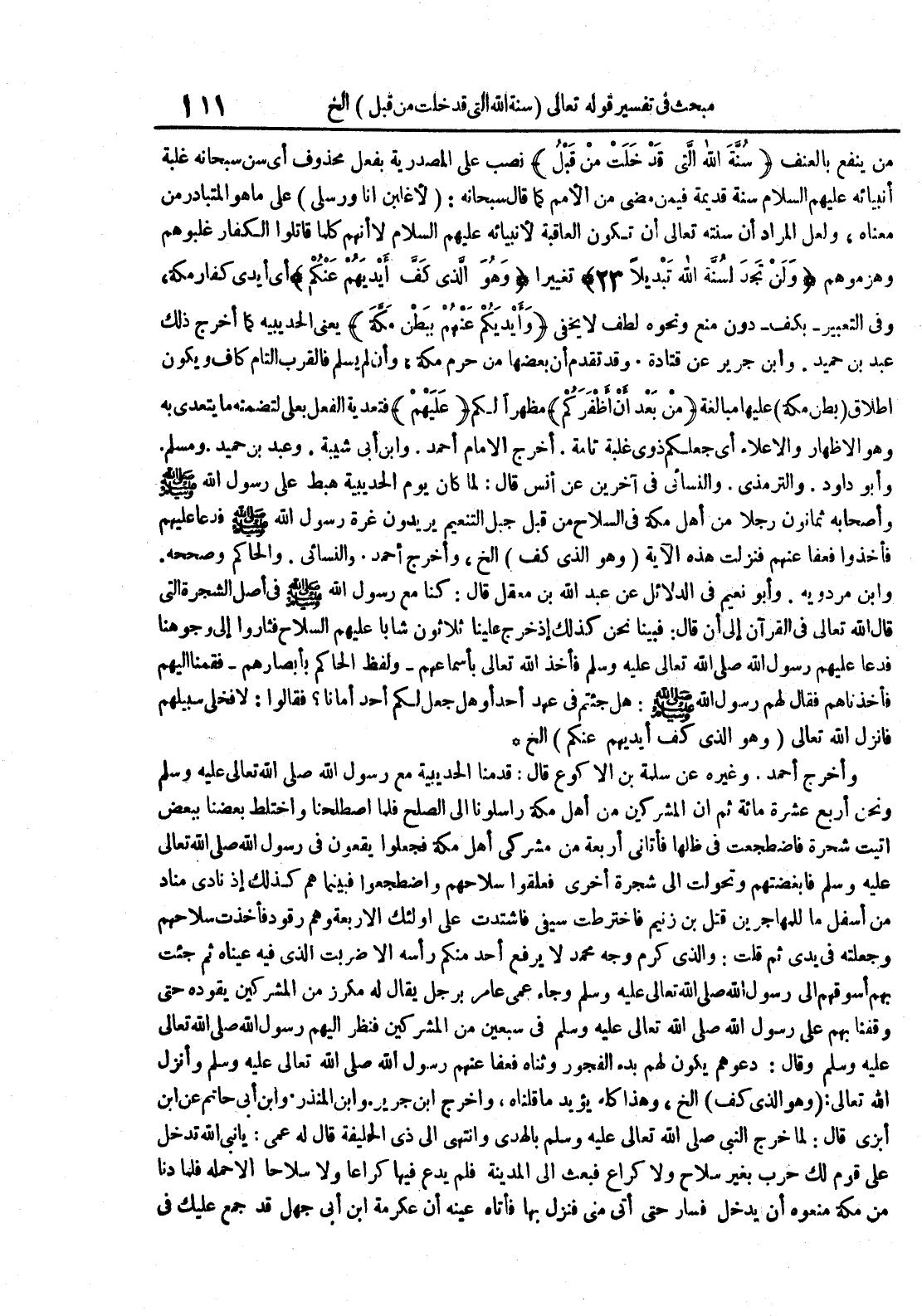 - تغييرا وهو الذي كف أيديهم عنكم أي كفار مكة وفي التعبير بكف دون منع ونحوه لطف لا يخف وأيدكم عنهم ببطن مكة يعني الحديبية كما أخرج ذلك عبد بن حميد وابن جرير عن قتادة وقد تقدم أن بعضها من حرم مكة وأن يسلم فالقرب التام كاف ويكون إطلاق بطن مكة عليها مبالغة من بعد أن أظفركم مظهرا لكم عليهم فتعدية الفعل بعل لتضمنه ما يتعد به وهو الأظهار والأعلاء أي جعلكم ذوي غلبة تامة أخرج الأمام أحمد وابن أبي شيبة وعبد بن حميد ومسلم وأبو داود والترمذي والنسائي في آخرين عن أنس قال : لما كان يوم الحديبية هبط عل رسول الله صلى الله عليه و سلم وأصحابه ثمانون رجلا من أهل مكة في السلاح من قبل جبل التنعيم يريدون غرة رسول الله صلى الله عليه و سلم فدعا عليهم فأخذوا فعفا عنهم فنزلت هذه الآية وهو الذي كف الخ وأخرج أحمد والنسائي والحاكم وصححه وابن مردويه وأبو نعيم في الدلائل عن عبد الله بن معقل قال : كنا مع رسول الله صلى الله عليه و سلم في أصل الشجرة التي قال الله تعالى في القرآن إلى أن قال : فبينا نحن كذلك إذ خرج علينا ثلاثون شابا عليهم السلاح فثاروا إلى وجوهنا فدعا عليهم رسول الله صلى الله تعالى عليه وسلم فأخذ الله تعالىبأسماعهم ولفظ الحاكم بأبصارهم فقمنا إليهم فأخذناهم فقال لهم رسول الله صلى الله عليه و سلم : هل جئتم في عهد أحد أو هل جعل لكم أماا فقالوا : لا فخلى سبيلها فأنزل الله تعالى وهو الذي كف أيديهم عنكم الخ