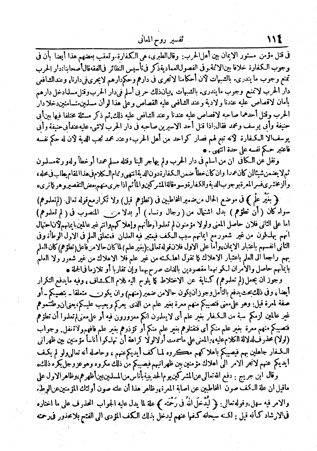 في قتل مؤمن مستور الإيمان بين أهل الحرب : وقال الطبري هي الكفارة وتعقب بعضهم هذا أيضا بأن في وجوب الكفارة خلافا بين الأئمة وفي الفصول العمادية ذكر في تأسيس النظائر في الفقه قال أصحابنا : دار الحرب تمنع وجوب ما يندريء بالشبهات لأن أحكامنا لا تجري في دارهم وحكم دارهم لا يجري في دارنا وعند الشافعي دار الحرب لا تمنع وجوب ما يندريء بالشبهات بيان ذلك حربي أسلم في دار الحرب وقتل مسلما دخل دارهم بأمان لا قصاص عليه عندنا ولا دية وعند الشافعي عليه القصاص وعلى هذا لو أن مسلمين متسامنين دخلا دار الحرب وقتل أحدهما صاحبه لا قصاص عليه وعند الشافعي عليه ذلك ثم ذكر مسئلة مختلفا فيها بين أبي حنيفة وأبي يوسف ومحمد فقال : إذا قتل أحد الأسيرين صاحبه في دار الحرب لا شيء عليه عند أبيحنيفة وأبييوسف إلا الكفارة لأنه تبع لهم فصار كواحد من أهل الحرب وعند محمد تجب الدية لأن له حكم نفسه فاعتبر حكم نفسه على حدة انتهى