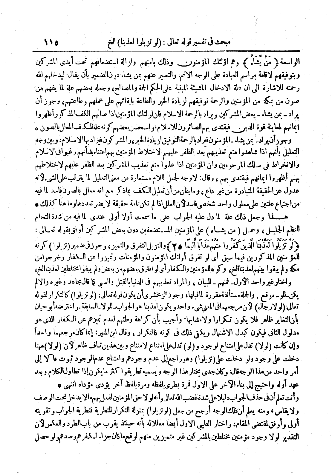 هذا وجعل ذلك علة لما دل عليه الجواب علىما سمعت أولا أولى عندي لما فيه من شدة التحام النظم الجليل وحمل من يشاء على المؤمنين المستضعفين دون بعض المشركين أوفق بقوله تعالى : لو تزيلوا لعذبنا الذين كفروا منهم عذابا أليما