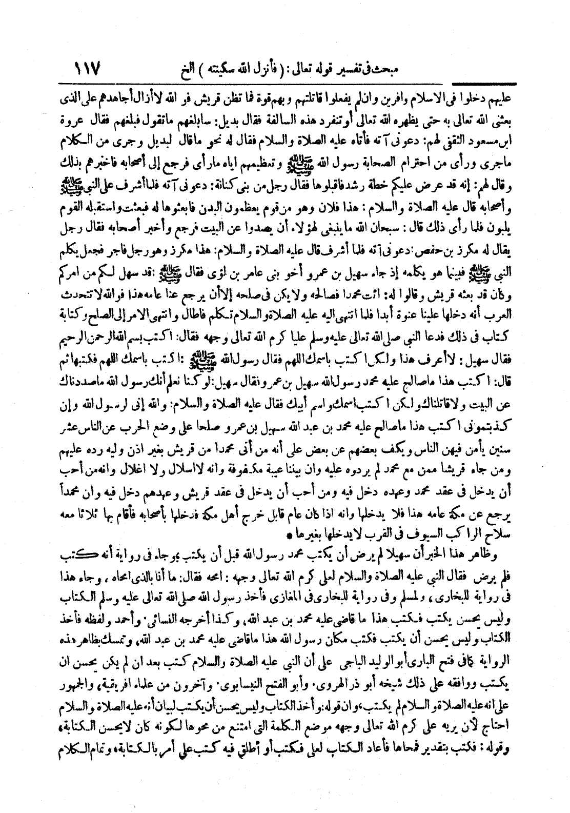 وظاهر هذا الخبر أنسهيلا لم يرض أنيكتب محمد رسول الله قبل أن يكتب وجاء في رواية أنهكتب فلم يرض فقال النبي عليه الصلاة و السلام لعلي كرم الله تعالى وجهه : امحه فقال : ما أنا بالذي أمحاه وجاء هذا في رواية للبخاري ولمسلم وفي رواية للبخاري في المغازي فأخذ رسول الله صلى الله تعالى عليه وسلم الكتاب وليس يحسن يكتب هذا ما قاضى عليه محمد بن عبد الله وكذا أخرجه النسائي وأحمد ولفظه فأخذ الكتاب وليس يحسن أن يكتب فكتب مكان رسول الله هذا ما قاضى عليه محمد بن عبد الله وتمسك بظاهر هذه الرواية كما في فتح الباري أبو الوليد الباجي على أن النبي عليه الصلاة و السلام كتب بعد أن لم يكن يحسن أن يكتب ووافقه على ذلك شيخه أبو ذر الهروي وأبو الفتح النيسابوري وآخرون من علماء افريقية والجمهور على أنه عليه الصلاة و السلام لم يكتب وإن قوله : وأخذ الكتاب وليس يحسن أنيكتب لبيان أنه عليه الصلاة و السلام احتاج لأنيريه علي كرم الله تعالى وجهه موضع الكلمة التي امتنع منمحوها لكونه كان لا يحسن الكتابة وقوله : فكتب بتقدير فمحاها فأعاد الكتاب لعلي فكتب أو أطلق فيه كتب علي أمر بالكتابة وتمام الكلام