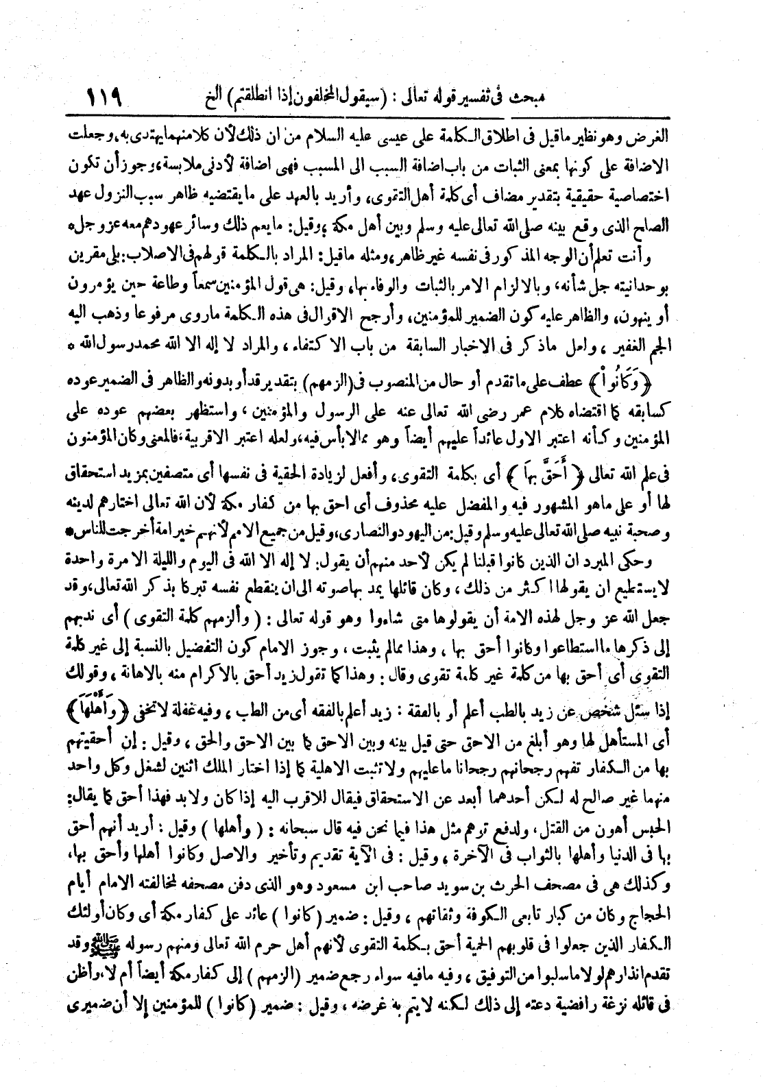 الغرض وهو نظير ما قيل في إطلاق الكلمة على عيسى عليه السلام من أن ذلك لأم كلا منهما يهتدى به وجعلت الأضافة على كونها بمعنى الثبات من باب إضافة السبب إلى المسبب فهي إضافة لأدنى ملابسة وجوز أن تكون اختصاصية حقيقية بتقدير مضاف أي كلمة أهل التقوى وأريد بالعهد على ما يقتضيه ظاهر سبب النزول عهد الصلح الذي وقع بينه صلى الله تعالى عليه وسلم وبين أهل مكة وقيل : ما يعم ذلكوسائر عهودهم معه عز و جل
