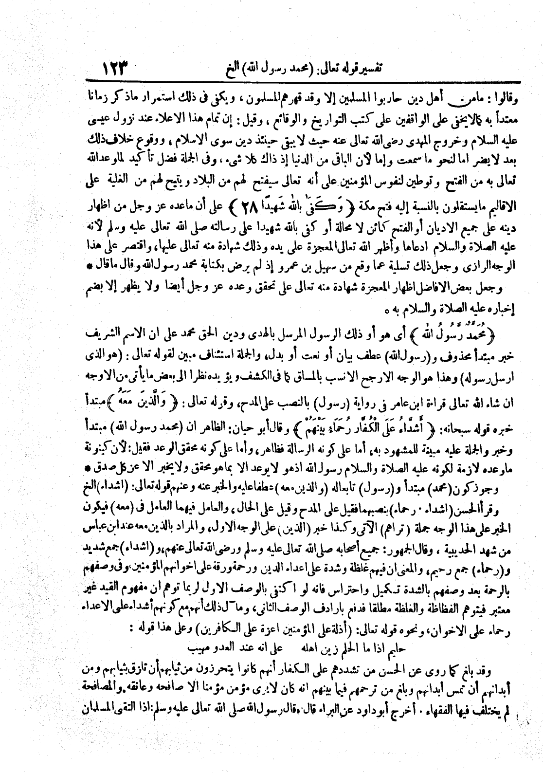 - على ما عده عز و جل من إظهار دينه على جميع الأديان أو القتح كائن لا محالة أو كفى بالله شهيدا على رسالته صلى الله تعالى عليه وسلم لأنه عليه الصلاة و السلام ادعاها وأظهر الله تعالى المعجزة على يده وذلك شهادة منه تعالى عليها واقتصر على هذا الوجه الرازي وجعل ذلك تسلية عما وقع من سهيل بن عمرو إذ لم يرض بكتابة محمد رسول الله وقال ما قال