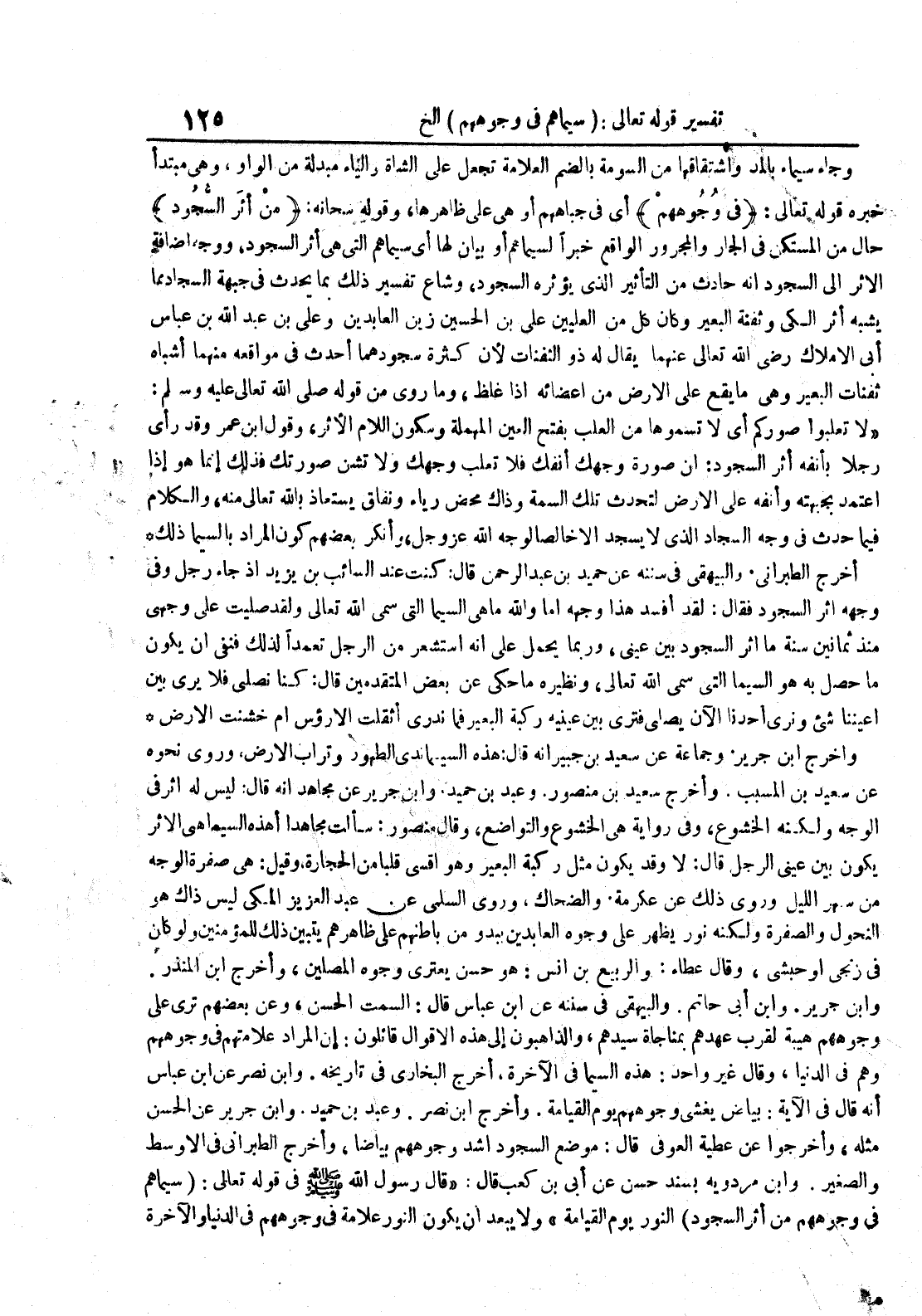 وأخرج ابن جرير وجماعة عن سعيد بن جبير أنه قال : هذه السيما ندري الطهور وتراب الأرض وروي نحوه عن سعيد بن المسيب وأخرج سعيد بن منصور وعبد بن حميد وابن جرير عن مجاهد أنه قال : ليس له أثر في الوجه ولكنه الخشوع وفي رواية هي الخشوع والتواضع وقال منصور : سألت مجاهدا أهذه السيما هي الأثر يكون بين عيني الرجل قال : لا وقد يكون مثل ركبة البعير وهو أقسى قلبا من الحجارة وقيل : هي صفرة الوجه من سهر الليل وروي ذلك عن عكرمة والضحاك وروي السلمي عن عبد العزيز المكي ليس ذاك هو النحول والصفرة ولكنه يظهر على وجوه العابدين يبدو من باطنهم على ظاهرهم يتبين ذلك للمؤمنين ولو كان في زنجي أو حبشي وقال عطاء : والربيع بن أنس : هو حسن يعتري وجوه المصلين وأخرج ابن المنذر وابن جرير وابن حاتم والبيهقي في سننه عن ابن عباس قال : السمت الحسن وعن بعضهم ترى على وجوههم هيبة لقرب عهدهم بمناجاة سيدهم والذاهبون إلى هذه الأقوال قائلون : إن المراد علامتهم في وجوههم وهم في الدنيا وقال غير واحد : هذه السيما في الآخرة أخرج البخاري في تاريخه وابن نصر عن ابن عباس أنه قال في الآية : بياض يغشى وجوههم يوم القيامة وأخرج ابن نصر وعبد بن حميد وابن جرير هم الحسن مثله وأخرجوا عن عطية العوفي قال : موضع السجود أشد وجوههم بياضا وأخرج الطبراني في الأوسط والصغير وابن مردويه بسند حسن عن أبي بن كعب قال : قال رسول الله صلى الله عليه و سلم في قوله تعالى : سيماهم في وجوههم من أثر السجود النور يوم القيامة ولا يبعد أن يكون النور علامة في وجوههم في الدنيا والآخرة