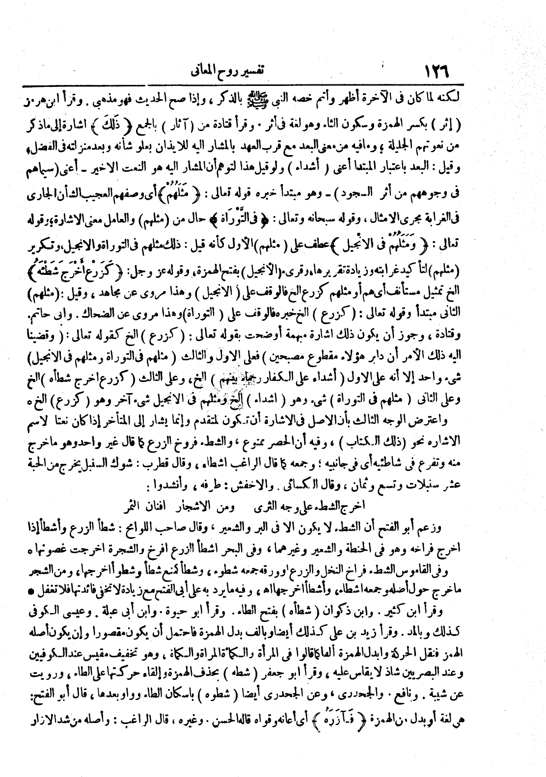 لكنه لما كان في الآخرة أظهر وأتتم خصه النبي صلى الله عليه و سلم بالذكر وإذا صح الحديث فهو مذهبي وقرأابن هرمز إثر بكسر الهمزة وسكون الثاء وهو لغة في أثر وقرأ قتادة من آثار بالجمع ذلك إشارة إلى ما ذكر من نعوتهم الجليلة وما فيه من البعد مع قرب العهد بالمشار إليه للإيذان بعلو شأنه وبعد منزلته في الفضل وقيل : البعد باعتبار المبتدأ أعني أشداء ولو قيل هذا لتوهم أن المشار إليه هو النعت الأخير أعني سيماهم في وجوههم من أثر السجود وهو مبتدأ خبره قوله تعالى : مثلهم أي وصفهم العجيب الشأن الجاري في الغرابة مجرى الأمثال وقوله سبحانه وتعالى : في التوراة حال من مثلهم والعامل معنى الإشارة وقوله تعالى : ومثلهم في الإنجيل عطف على مثلهم الأول كأنه قيل : ذلك مثلهم في التوراة والإنجيل وتكرير مثلهم لتأكيد غرابته وزيادة تقريرها وقريء الأنجيل بفتح الهمزة وقوله عز و جل : كزرع أخرج شطئه الخ تمثيل مستأنف أي هم أو مثلهم كزرع الخ فالقوف على الأنجيل وهذا مروي عن مجاهد وقيل : مثلهم الثاني مبتدأ وقوله تعالى : كزرع الخ خبره فالوقف على التوراة وهذا مروي عن الضحاك وأبي حاتتم وقتادة وجوز أن يكون ذلك إشارة مبهمة أوضحت بقوله تعالى : كزرع الخ كقوله تعالى : وقضينا إليه ذلك الأمر دار هؤلاء مقطوع مصبحين فعلى الأول والثالث مثلهم في التوراة ومثلهم في الأنجيل شيء واحد إلا أنه على الأول أشداء على الكفار رحماء بينهم الخ وعلى الثالث كزرع أخرج شطأه الخ وعلى الثاني مثلهم في التوراة شيء وهو أشداء الخ ومثلهم في الأنجيل شيء آخر وهو كزرع الخ