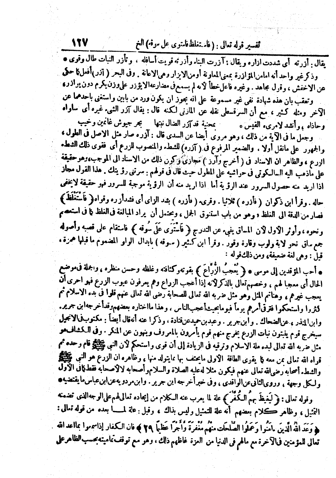 ومن مجيئها للبيان داخلة على ضمير الغائب قوله تعالى : لو تزيلوا لعذبنا الذين كفروا منهم عند القائلين بأن ضمير تزيلوا للمؤمنين لا للتبعيض كما يقوله الشيعة الزاعمون ارتداد أكثر الصحابة رضي الله تعالى عنهم من أهل بيعة الرضوان وغيرهم فإنمدحهم السابق بما يدل على الأستمرار التجدي كقوله تعال : تراهم ركفا سجدا ووصفهم بما يدل على الدوام والثبات كقوله سبحانه : والذين معه أشداء على الكفار يأبى التبعيض والأرتداد الذين زعموه عند من له أدنى إنصاف وشمة من دين ويزيد زعمهم هذا سقوطا عن درجة الأعتبار أن مدحهم ذاك قد كتبه الله تعالى في التوراة قبل أن يخلق السماوات والأرض ولا يكاد عاقل يقبل أنه تعالى أطلق المدح وكتبه لأناس لم يثبت الصفة إلا قليل منهم وإذا قلنا : إن هؤلاء الممدوحين هم أهل بيعة الرضوان الذين بايعوه عليه الصلاة و السلام في الحديبية كما يشعر به والذين معه لا سيما على القول بأن السورة بتمامها نزلت عند منصرفه عليه الصلاة و السلام من الحديبية قبل أن يتفرقوا عنه صلى الله تعالى عليه وسلم كان سقوط ذلك الزعم أبين وأبين لأن الأرتداد الذي يزعمونه كان لترك مبايعة علي كرم الله تعال وجهه بعد وفاة رسول الله صلى الله عليه و سلم مع العلم بالنص عل خلافته بزعمهم ومبايعة أبي بكر رضي الله تعالى عنه وكيف يكون ذاك ارتداد واتلله عز و جل حين رضي عنهم علم أنهم يفعلونه والقول بأنه سبحانه إنما رضي عن مبايعتهم أو عنهم من حيث المبايعة ولم يرض سبحانه عنهم مطلقا لأجلها خلاف ظاهر الآية والظاهر ما نفي ولا يعكر عليه صدور بعض المعاصي من بعضهم بعد وإنما يعكر صدور ما لا يجامع الرضا أصلا كالأرتداد والعياذ بالله تعال وبالجملة جعل من للتبعيض ليتم للشيعة ما زعموه يأباه الكتاب والسنة وكلام العترة وفي التحفة الأثني عشرية من ذلك ما تنشرح له الصدور وتزداد قلوب المؤمنين نورا عل نور ويا سبحان الله أين جعل من للتبعيض من دعو الأرتداد ولكن من يضلل الله فما له من هاد وتأخير منهم هنا عن عملوا الصالحات وتقديم منكم عليه في ية النور التي ذكرناها نفا لأن عمل الصالحات لا ينفك عنهم وذلك ثمت لبيان الخلفاء والعمل الصالح ليس موقوفا عليه لاستمرار صحة خلافتهم حت لا ينعزلوا بالفسق وقال ابن جرير : منهم يعني الشطء الذي أخرجه الزرع وهم الداخلون في الأسلام إل يوم القيامة فأعاد الضمير عل معن الشطء وكذلك فعل البغوي ولا يخفى بعده