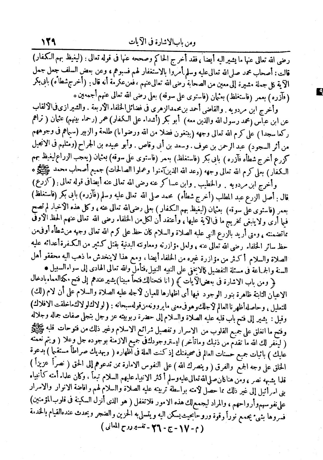 رضي الله تعالى عنها ما يشير إليه أيضا فقد أخرج الحاكموصححه عنها في قوله تعالى : ليغيظ بهم الكفار قالت : أصحاب محمد صلى الله تعالى عليه وسلم أمروا بالأستغفار لهم فسبوهم وعنبعض السلف جعل جمل الآية كل جملة مشيرة إلىمعين منالصحابة رضي الله تعالى عنهم فعن عكرمة أنه قال : أخرج شطأه بأبيبكر فآزره بعمر فاستغلظ بعثمان فاستوى على سوقه بعلي رضي الله تعالى عنهم أجمعين