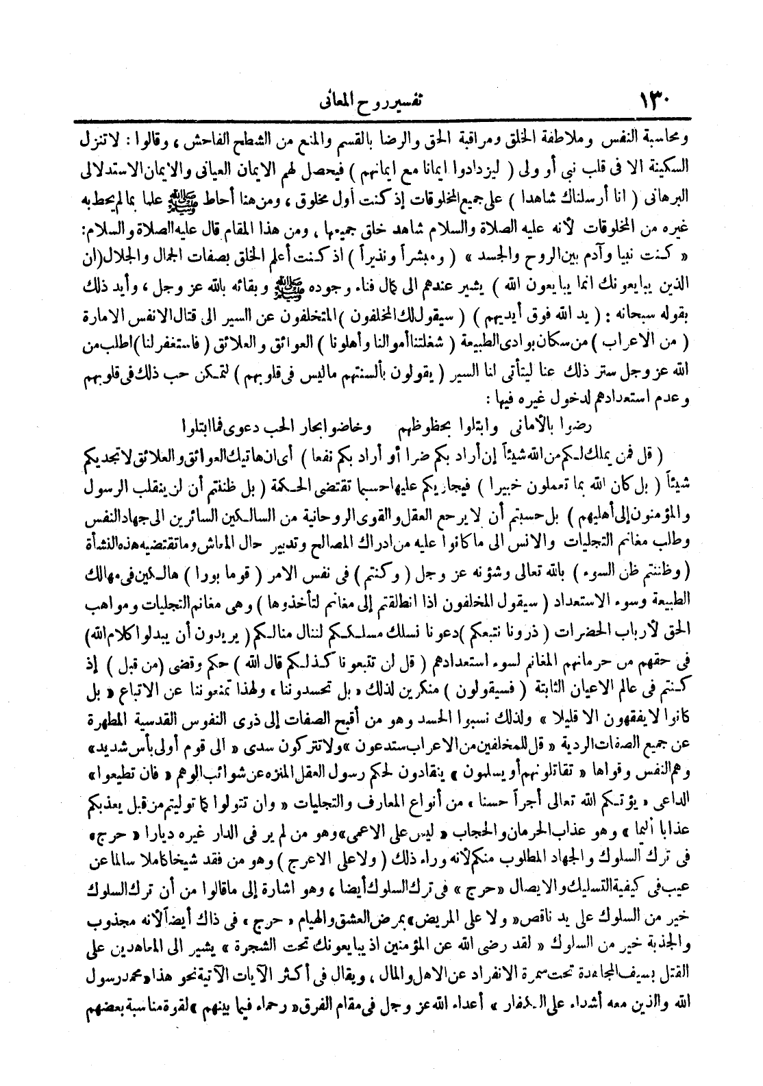 ومحاسبة النفس وملاطفة الخلق ومراقبة الحق والرضا بالقسم والمنع من الشطح الفاحش وقالوا : لا تنزلالسكينة إلا في قلب نبي أو ولي ليزدادوا إيمانا مع إيمانهم فيحصل لهمالإيمان العياني والإيمان الأستدلالي البرهاني إنا أرسلناك شاهدا على جميع المخلوقات إذ كنت أول مخلوق ومنهنا أحاط صلى الله عليه و سلم علما بما لم يحط به غيره من المخلوقات لأنه عليه الصلاة و السلام شاهد خلق جميعها ومن هذا المقام قال عليه الصلاة و السلام : كنت نبيا وآدم بين الروح والجسد ومبشرا ونذيرا إذ كنتأعلم الخلق بصفات الجمال والجلال إن الذين يبايعونك إنما يبايعون الله يشير عندهم إلى كمال فناء وجوده صلى الله عليه و سلم وبقائه عز و جل وأيد ذلك بقوله سبحانه : يد الله فوق أيديهم سيقول لك المخلفون المتخلفون عن السير إلى قتال الأنفس الأمارة من الأعراب من سكان بوادي الطبيعة شغلتنا أموالنا وأهلونا العوائق والعلائق فاستغفر لنا اطلب من الله عز و جل ستر ذلك عنا ليتأتى لنا السير يقولون بألسنتهم ما ليس في قلوبهم لتمكن حب ذلك في قلوبهم وعدم استعدادهم لدخول غيره فيها : رضوا بالأماني وابتلوا بحظوظهم وخاضوا بحار الحب دعوى فما ابتلوا قل فمن يملك لكم من الله شيئا إن أراد بكم ضرا أو أراد بكم نفعا أي هاتيك العوائق والعلائق لا تجديكم شيئا بل كان الله بما تعملون خبيرا فيجازيكم عليها حسبما تقتضي الحكمة بل ظننتم أن لن ينقلب الرسول والمؤمنون إلى أهليهم بل حسبتم أن لا يرجع العقل والقوى الروحانية من السالكين السائرين إلى جهاد النفس وطلب مغانم التجليات والأنس إلى ما كانواعليه من إدراك المصالح وتدبير حال المعاش وما تقتضيه هذه النشأة وظنهم ظن السوء بالله تعالى وشؤنه عز و جل وكنتم في نفس الأمر قوما بورا هالكين في مهالك الطبيعة وسوء الأستعداد سيقول المخلفون إذا انطلقتم إلى مغانم لتأخذوها وهي مغانم التجليات ومواهب الحق لأرباب الحضرات ذرونا نتبعكم دعونا نسلك مسلككم لننال منالكم يريدون أن يبدلوا كلام الله في حقهم من حرمانهم المغانم لسوء استعدادهم قل لن تتبعونا كذلكم قال الله حكم وقضى من قبل إذ كنتم في عالم الأعيان الثابتة فسيقولون منكرين لذلك بل تحسدوننا ولهذا تمنعوننا عن الأتباع بل كانوا لا يفقهون إلا قليلا ولذلك نسبوا الحسد وهو من أقبح الصفات إلى ذوي النفوس القدسية المطهرة عن جميع الصفات الردية قل للمخلفين من الأعراب ستدعون ولا تتركون سدى إلى قوم أولي بأس شديد وهم النفس وقواها وتقاتلونهم أو يسلمون ينقادون لحكم رسول العقل المنزه عن شوائب الوهم فإن تطيعوا الداعي يؤتكم الله أجرا حسنا من أنواع المعارف والتجليات وإن تتولوا كما توليتم من قبل يعذبكم عذابا أليما وهو عذاب الحرمان والحجاب ليس على الأعمى وهو من لم ير في الدار غيره ديارا حرج في ترك السلوك والجهاد المطلوب منكم لأنه وراء ذلك ولا على الأعرج وهو من فقد شيخا كلاما سالما عن عيب في كيفية التسليك والإيصال حرج في ترك السلوك أيضا وهو إشارة إلى ما قالوا من أن ترك السلوك خير من السلوك على يد ناقص ولا على المريض بمرض العشق والهيام حرج في ذاك أيضا لأنه مجذوب والجذبة خير من السلوك لقد رضي الله عنها المؤمنين إذ يبايعونك تحت الشجرة يشير إلى المعاهدين على القتل بسيف المجاهدة تحت سمرة الأنفراد عن الأهل والمال ويقال في أكثر الآيات الآتية نحو هذا محمد رسول الله والذين معه أشداء على اتلكفار أعداء الله عز و جل في مقام الفرق رحماء فيما بينهم لقوة مناسبة بعضهم