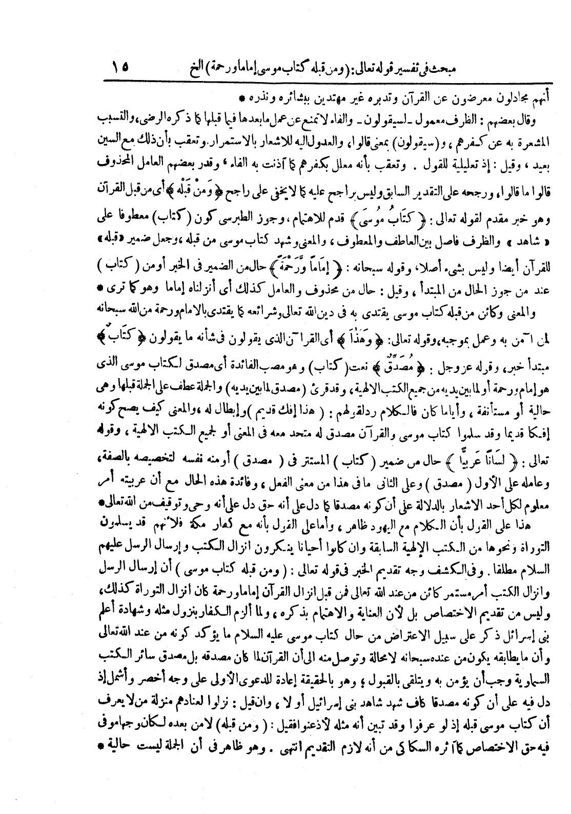 هذا على القول بأن الكلام مع اليهود ظاهر وأما على القول بأنه مع كفار مكة فلأنهم قد يسلمون التوراة ونحوها من الكتب الإلهية السابقة وإن كانوا أحيانا ينكرون إنزال الكتب وإرسال الرسل عليهم السلام مطلقا وفي الكشف وجه تقديم الخبر في قوله تعالى : ومن قبله كتاب موسى أن إرسال الرسل وإنزال الكتب أمر مستمر كائن من عند الله تعالى فمن قبل إنزال القرآن إماما ورحمة كأن إنزال التوراة كذلك وليس من تقديما لأختصاص بل لأن العناية والأهتمام بذكره ولما ألزم الكفار بنزول مثله وشهادة أعلم بني إسرائيل ذكر على سبيل الأعتراض من حال كتاب موسى عليه السلام ما يؤكد كونه من عند الله تعالى وإن ما يطابقه يكون من عنده سبحانه لا محالة وتوصل منه أن القرآن لما كان مصدقه بل مصدق سائر الكتب السماوية وجب أن يؤمن به ويتلقى بالقبول وهو بالحقيقة إعادة للدعوى الأولى على وجه أخصر وأشمل إذ دل فيه على أن كونه مصدقا كاف شهد شاهد بني إسرائيل أولا وإن قيل : نزلوا لعنادهم منزلة من لا يعرف أن كتاب موسى قبله إذ لو عرفوا وقد تبين أنه مثله لأذعنوا فقيل : ومن قبله لا من بعده لكان وجها موفي فيه حق الأختصاص كما آثره السكاكي من أنه لازم التقديم انتهى وهو ظاهر في أن الجملة ليست حالية