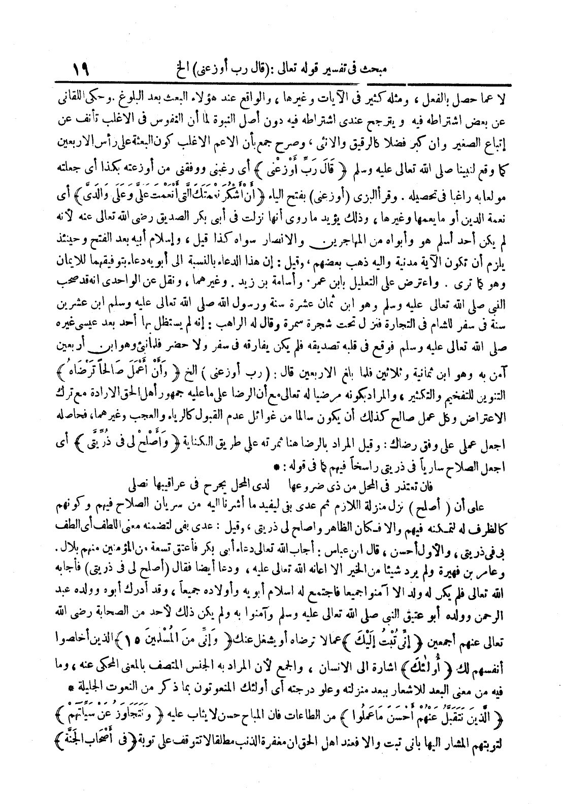 لا عما حصل بالفعل ومثله كثير في الآيات وغيرها والواقع عند هؤلاء البعث بعد البلوع وحكى اللقاني عن بعض اشتراطه فيه ويترجح عندي اشتراطه فيه دون أصل النبوة لما أن النفوس في الأغلب تأنف عن إتباع الصغير وإن كبر فضلا كالرقيق والأنثى وصرح جمع بأن الأعم الأغلب كون البعثة على رأس الأربعين كما وقع لنبي ناصص قال رب أوزعني أي رغبني ووفقني من أوزعته بكذا أي جعلته مولعا به راغبا في تحصيله وقرأ البزي أوزعني بفتح الياء أن أشكر نعمتك التي أنعمت علي وعلى والدي أي نعمة الدين أو ما يعمها وغيرها وذلك يؤيد ما روي أنها نزلت في أبي بكر الصديق رضي الله تعالى عنه لأنه لم يكن أحد أسلم هو وأبواه من المهاجرين والأنصار سواه كذا قيل وإسلام أبيه بعد الفتح وحينئذ يلزم أن تكون الآية مدنية وإليه ذهب بعضهم وقيل : إن هذا الدعاء بالنسبة إلى أبويه دعاء بتوفيقهما للإيمان وهو كما ترى واعترض على التعليل بابن عمر وأسامة بن زيد وغيرهما ونقل عن الواحدي أنه قد صحب النبي صلى الله تعالى عليه وسلم وهو ابن ثمان عشرة سنة ورسول الله صلى الله تعالى عليه وسلم ابن عشرين سنة في سفر للشام في التجارة فنزل تحت شجرة سمرة وقال له الراهب : إنه لم يستظل بها أحد بعد عيسى غيره صلى الله تعالى عليه وسلم فوقع في قلبه تصديقه فلم يكن يفارقه في سفر ولا حضر فلما نبيء وهو ابن أربعين آمن به وهو ابن ثمانية وثلاثين فلما بلغ الأربعين قال : رب أوزعني الخ وأن أعمل صالحا ترضاه التنوين للتفخيم والتكثير والمراد بكونه مرضيا له تعالى مع أن الرضا على ما عليه جمهور أهل الحق الإرادة مع ترك الأعتراض وكل عمل صالح كذلك أن يكون سالما من غوايء لعدم القبول كالرياء والعجب وغيرهما فحاصله اجعل عملي على وفق رضاك : وقيل المراد بالرضا هنا ثمرته على طريق الكناية وأصلح لي في ذريتي أي اجعل الصلاح ساريا في ذريتي راسخا فيهم كما في قوله :