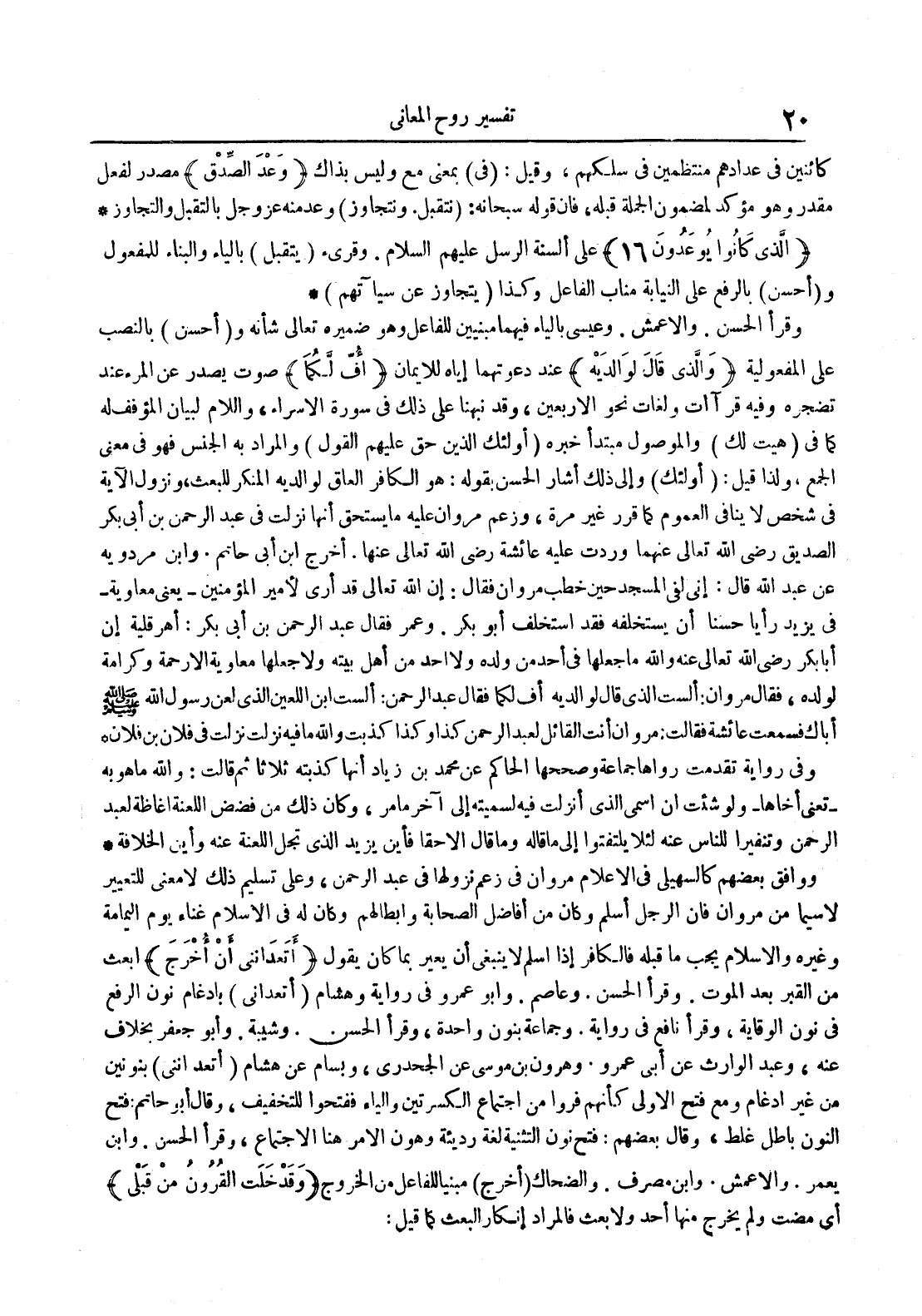 وقرأ الحسن والأعمش وعيسى بالياء فيهما مبنيين للفاعل وهو ضميره تعالى شأنه و أحسن بالنصب على المفعولية والذي قال لوالديه عند دعوتهما إياه للإيمان أف لكما صوت يصدر عنالمرء عند تضجره وفيه قراآت ولغات نحو الأربعين وقد نبهنا على ذلك في سورة الإسراء واللام لبيان الؤفف له كما في هيت لك والموصول مبتدأ خبره أولئك الذين حق عليهم القول والمراد به الجنس فهو في معنى الجمع ولذا قيل : أولئك وإلى ذلك أشار الحسن بقوله : هو الكافر العاق لوالديه المنكر للبعث ونزول الآية في شخص لا ينافي العموم كما قرر غير مرة وزعم مروان عليه ما يستحق أنها نزلت في عبد الله بن أبي بكر الصديق رضي الله تعالى عنهما وردت عليه عائشة رضي الله تعالى عنها أخرج ابن أبي حاتم وابن مردويه عن عبد الله قال : إني لفي المسجد حين خطب مروان فقال : إن الله تعالى قد أرى لأمير المؤمنين يعني معاوية في يزيد رأيا حسنا يستخلفه فقد استخلف أبو بكر وعمر فقال عبد الرحمن بن أبي بكر : أهرقلية إن أبا بكر رضي الله تعالى عنه والله ما جعلها في أحد من ولده ولا أحد من أهل بيته ولا جعلها معاوية إلا رحمة وكرامة لولده فقال مروان : ألست الذي قال لوالديه أف لكما فقال عبد الرحمن : ألست ابن اللعين الذي لعن رسول الله صلى الله عليه و سلم أباك فسمعت عائشة فقالت : مروان أنت القائل لعبد الرحمن كذا وكذا كذبت والله فيه فنزلت في فلان بن فلان