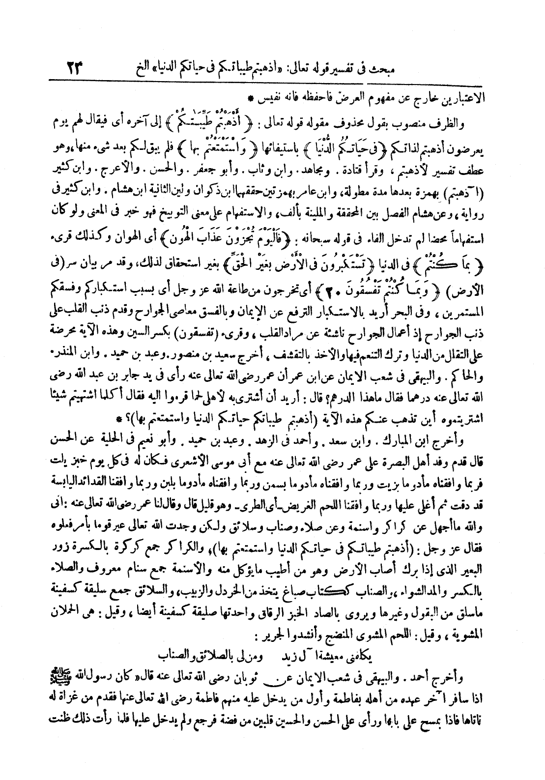 وأخرج ابن المبارك وابن سعد وأحمد في الزهد وعبد بن حميد وأبو نعيم في الحلية عن الحسن قال قدم وفد أهل البصرة على عمر رضي الله تعالى عنه مع أبي موسى الأشعري فكان في كل يوم خبز يلت فربما وافقناه مأدوما بزيت وربما وافقناه مأدوما بسمن وربما وافقناه مأدوما بلبن وربما وافقنا القدائد اليابسة قد دقت ثم أغلي عليها وربما وافقنا اللحم الغريض أي الطري وهو قليل قال وقال لنا عمر رضي الله تعالى عنه : إني والله ما أجهل عن كراكر واسمنة وعن صلاء وصناب وسلائق ولكن وجدت الله تعالى عير قوما بأمر فعلوه فقال عز و جل : أذهبتم طيباتكم في حياتكم الدنيا واستمتعتم بها والكراكر جمع كركرة بالكسرة زور البعير الذي إذا برك أصاب الأرض وهو من أطيب ما يؤكل منه والأسمنة جمع سنام معلاوف والصلاء بالكسر والمدالشواء والصناب ككتاب صباغ يتخذ من الخردل والزبيب والسلائق جمع سليقة كسفينة ما سلق من البقول وغيرها ويروى بالصاد الخبز الرقاق واحدتها صليقة كسفينة أيضا وقيل : هي الحملان المشوية وقيل : اللحم المشوي المنضج وأنشدوا الجرير : يكلفني معيشة آل زيد ومن لي بالصلائق والصناب وأخرج أحمد والبيهقي في شعب الإيمان عن ثوبان رضي الله تعالى عنه قال كان رسول الله صلى الله عليه و سلم إذا سافر آخر عهده من أهله بفاطمة وأول من يدخل عليه منهم فاطمة رضي الله تعالى عنها فقدم من غزاة له فأتاها فإذا بمسح على بابها ورأى على الحسن والحسين قلبين من فضة فرجع ولم يدخل عليها فلما رأت ذلك ظنت