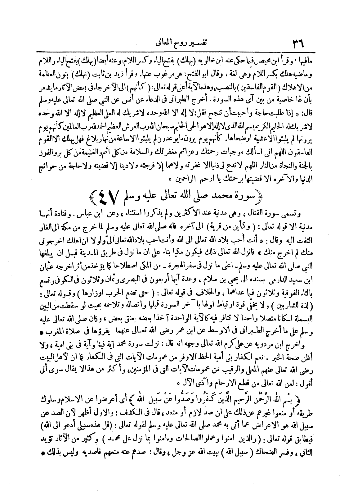 وتسمى سورة القتال وهي مدنية عند الأكثرين ولم يذكروا استثناء وعن ابن عباس وقتادة أنها مدنية إلا قوله تعالى : وكأين من قرية إلى آخره فإنه صلى الله تعالى عليه وسلم لما خرج من مكة إلى الغار التفت إليه وقال : أنت أحب بلاد الله تعالى إلي وأنت أحب بلاد الله تعالى إلي ولو لا أن أهلك أخرجوني منك لم أخرج منك فأنزل الله تعالى ذلك فيكون مكيا بناء على أن ما نزل في طريق المدينة قبل أن يبلغها النبي صلى الله تعالى عليه وسلم أعني ما نزل في سفر الهجرة من المكي اصطلاحا كما كما يؤخذ من أثر أخرجه عثمان ابن سعيد الدارمي بسنده إلى يحيى بن سلام وعدة آيها أربعون في البصري وثلاثونفي الكوفي وتسع بالتاء الفوقية وثلاثون فيما عداهما والخلاف في قوله تعالى : حتى تضع الحرب أوزارها وقوله تعالى : لذة للشاربين ولا يخفى قوة ارتباط أولها بآهر السورة قبلها واتصاله وتلاحمه بحيث لو سقطت من البين البسملة لكانا متصلا واحدا لا تنافر فيه كالآية الواحدة آخذا بعضه بعنق بعض وكان صلى الله تعالى عليه وسلم على ما أخرج الطبراني في الأوسط عن ابن عمر رضي الله تعالى عنهما يقرؤها في صلاة المغرب