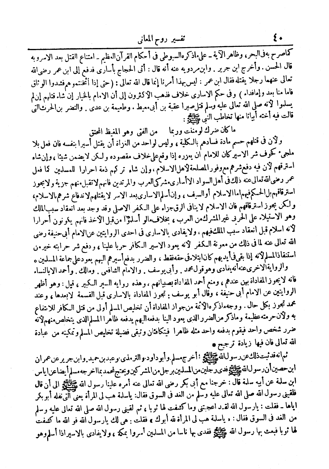 كما صرح به في البحر وظاهر الآية على ما ذكره السيوطي في أحكام القرآن العظيم امتناع القتل بعد الأسر وبه قال الحسن وأخرج ابن جرير وابن مردويه عنه أنه قال : أتى الحجاج بأسارى فدفع إلى ابن عمر رضي الله تعالى عنهما رجلا يقتله فقال ابن عمر : ليس بهذا أمرنا إنما قال الله تعالى : حتى إذا أثخنتموهم فشدوا الوثاق فإما منا بعد وإما فداء وفي حكم الأسارى خلاف فذهب الأكثرون إلى أن الإمام بالخيار إن شاء قتلهم إن لم يسلموا لأنه صلى الله تعالى عليه وسلم قتل صبرا عقبة بن أبي معيط وطعيمة بن عدي والنضر بن الحرث التي قالت فيه أخته أبياتا منها تخاطب النبي صلى الله عليه و سلم : ما كان ضرك لو مننت وربما من الفتى وهو المعيط المحنق ولأن في قتلهم حسم مادة فسادهم بالكلية وليس لواحد من الغزاة أن يقتل أسيرا بنفسه فإن فعل بلا ملجيء كخوف شر الأسير كان للإمام أن يعزره إذا وقع على خلاف مقصوده ولكن لا يضمن شيئا وإن شاء أسترقهم لأن فيه دفع شرهم مع وفور المصلحة لأهل الإسلام وإن شاء تركهم ذمة أحرارا للمسلمين كما فعل عمر رضي الله تعالى عنه ذلك في أهل السواد إلا أسارى مشركي العرب والمرتدين فإنهم لا تقبل منهم جزية ولا يجوز استرقاقهم بل الحكم فيهم إما الإسلام أو السيف وإن أسلم الأسارى بعد الأسر لا يقتلهم لاندفاع شرهم بالأسلام ولكن يجوز استرقاقهم فإن الإسلام لا ينافي الرق جزاء على الكفر الأصلي وقد وجد بعد انعقاد سبب الملك وهو الإستيلاء على الحربي غير المشرك من العرب بخلاف ما لو أسلموا من قبل الأخذ فإنهم يكونون أحرارا لأنه إسلام قبل انعقاد سبب الملك فيهم ولا يفادي بالأسارى في أحدى الروايتين عن الإمام أبي حنيفة رضي الله تعالى عنه لما في ذلك من معونة الكفر لأمنه يعود الأسير الكافر حربا علينا ودفع حرابته خير من استنقاذ المسلم لأنه إذا بقي في أيديهم كان ابتلاء في حقه فقط والضرر أسيرهم إليهم يعود على جماعة المسلمين