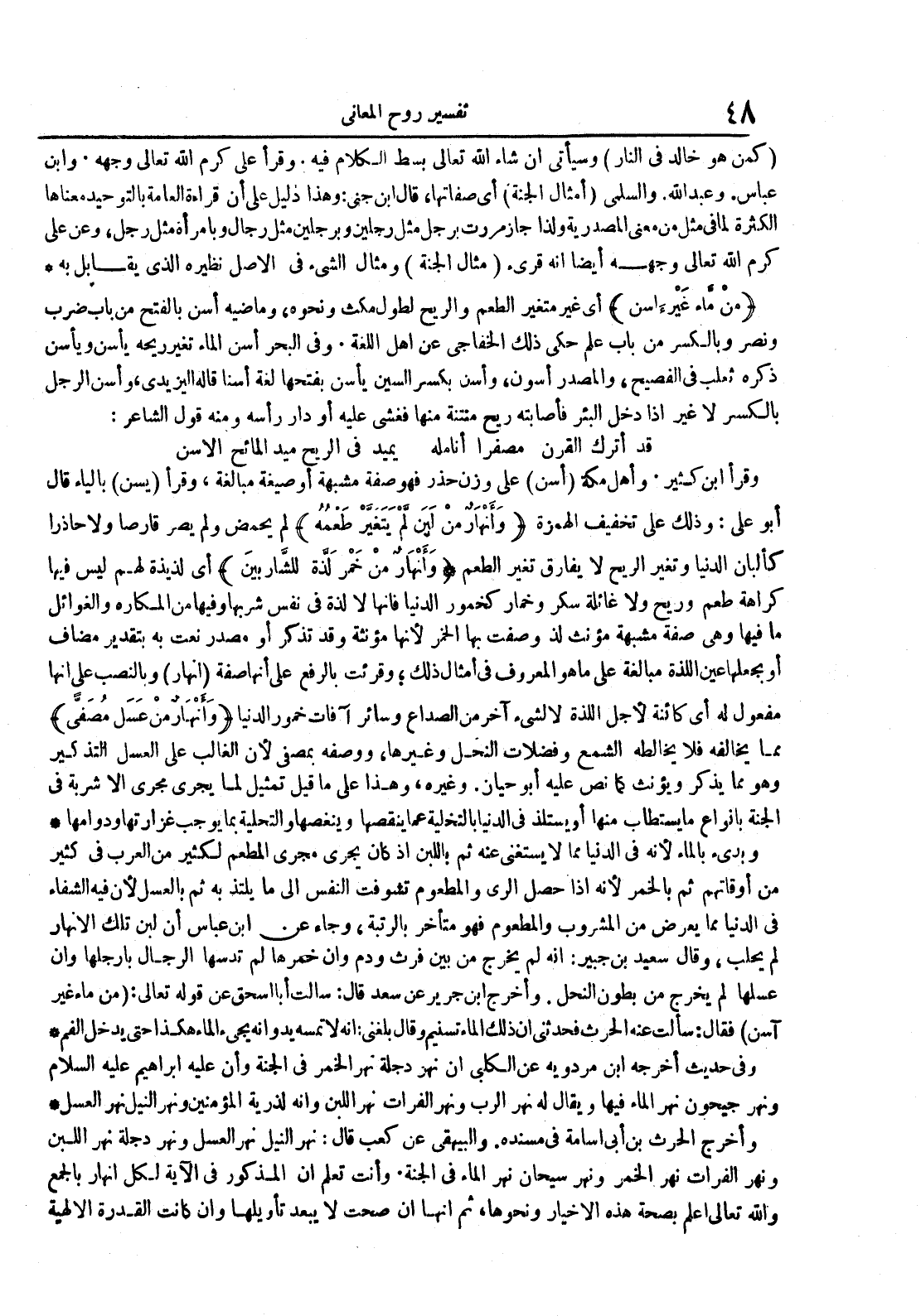 وأخرج الحرث بن أبي أسمامة في مسنده والبيهقي عن كعب قال : نهر النيل نهر العسل ونهر دجلة نهر اللبن ونهر الفرات نهر الخمر ونهر سيحان نهر الماء في الجنة وأنت تعلم أن المذكور في الآية لكل أنهار بالجمع والله تعالى أعلم بصحة هذه الأخيار ونحوها ثم أنها صحت لا يبعد تأويلها وإن كانت القدرة الإلهية
