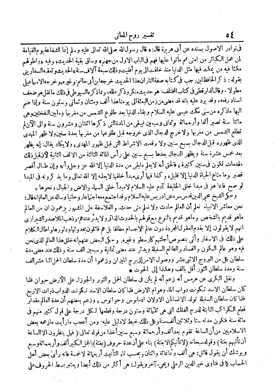 ونقل البكري عن هرمس أنه زعم أنه لم يكن في سلطان الحمل والثور والجوزاء على الأرض حيوان فلما كان سلطان الأسد تكونت دواب الماء وهوام الأرض فلما كان سلطان الأسد تكونت الدواب ذوات الأربع فلما كان سلطان السنبلة تولد الإنسانان الأولان أدمانوس وحوانوس وزعم بعضهم أن مدة العالم مقدار قطع الكواكب الثابتة لدرج الفلك التي هي ثلثمائة وستون درجة وقطعها لكل درجة على قول كثير منهم في مائة سنة فتكون مدته ستا وثلاثين ألف سنة وكل ذلك خبط لا دليل عليه ومن أعجب ما رأيت ما زعمه بعضالإسلاميين من أن الساعة تقوم بعد ألف وأربعمائة وسبع سنين أخذا من قوله تعالى : فهل ينظرون إلا الساعة أن تأتيهم بغتة وقوله سبحانه لا تأتيكم إلا بغتة بناء على أن عدة حروف بغتة بالجمل الكبير ألف وأربعمائة وسبع ويوشك أن يقول قائل : هي ألف وثمانمائة واثنان وبحسب تاء التأنيث أربعمائة لا خمسة فإنه رأى بعض أهل الحساب كما في فتاوي خير الدين الرملي ويجيء آخر ويقول : هي أكثر من ذلك أيضا ويعتبر بسط الحروف على