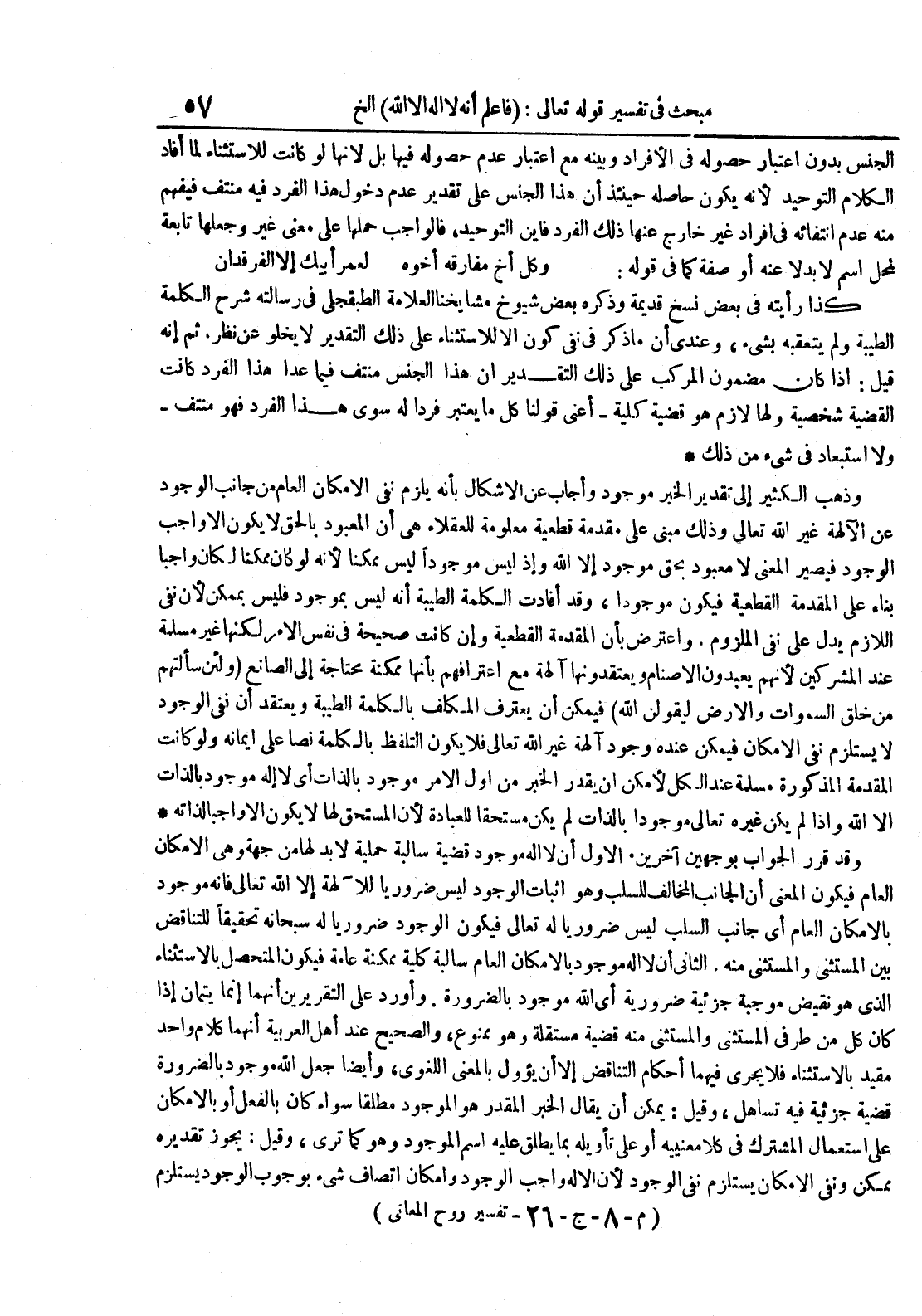 الجنس بدون اعتبار حصوله في الأفراد وبينه مع اعتبار عدم حصوله فيها بل لأنها لو كانت للأستثناء لما أفاد الكلام التوحيد لأنه يكون حاصله حينئذ أن هذا الجنس على تقدير عدم دخول هذا الفرد فيه منتف فيفهم منه عدم انتفائه في أفراد غير خارج عنها ذلك الفرد فأين التوحيد فالواجب حملها على معنى غير وجعلها تابعة لمحل اسم لا بدلا عنه أو صفة كما في قوله : وكل أخ مفارقه أخوه لعمر أبيك إلا الفردان كذا رأيته في بعض نسخ قديمة وذكره بعض شيوخ مشايخنا العلامة الطبقجلي في رسالته شرح الكلمة الطيبة ولم يتعقبه بشيء وعندي أن ما ذكر في نفي كون إلا للأستثناء على ذلك التقدير لا يخلو عن نظر ثم إنه قيل : إذا كان مضمون المركب على ذلك التقدير أن هذا الجنس منتف فيما عدا هذا الفرد كانت القضية شخصية ولها لازم هو قضية كلية أعني قولنا كل ما يعتبر فردا له سوى هذا الفرد فهو منتف ولا استبعاد في شيء من ذلك